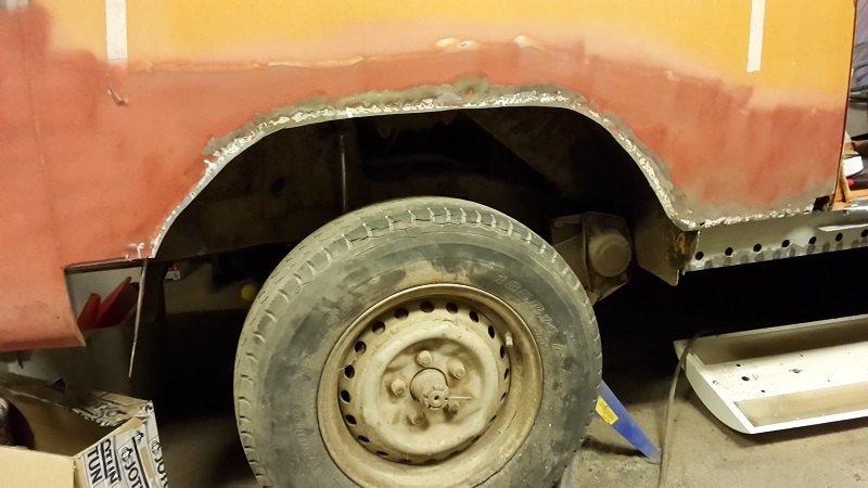Åter till de bakre hjulhusen. När jag köpte bussen hade den lite konstiga avslut på skärmkanterna. Nästan som åttiotals skärmbreddare. Det visade sig att den finska grovsmeden hade varit i farten igen. Fast lite impad blir jag dock med tanke på vilken fin form han hade fått på tvåmillimetersplåten..... Kan inte ha varit lätt att bocka den i en snygg radie. Syns inte riktigt på bilden då den är tagen i tokig vinkel.