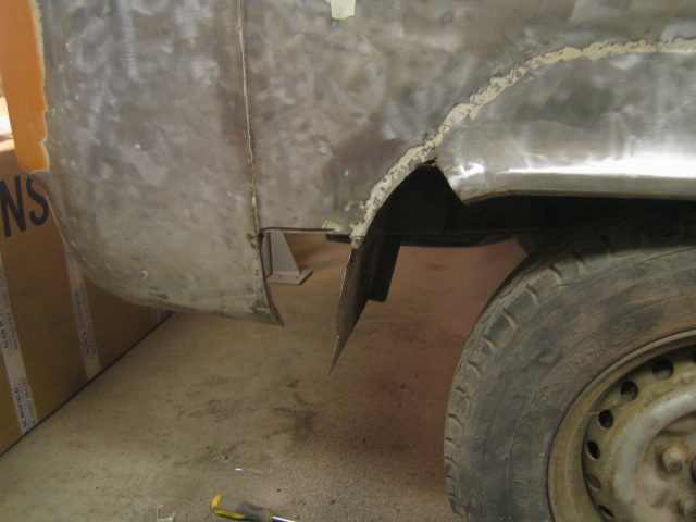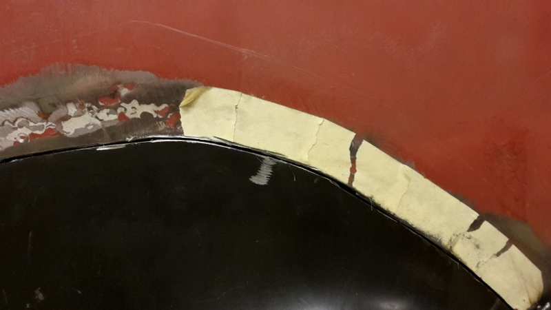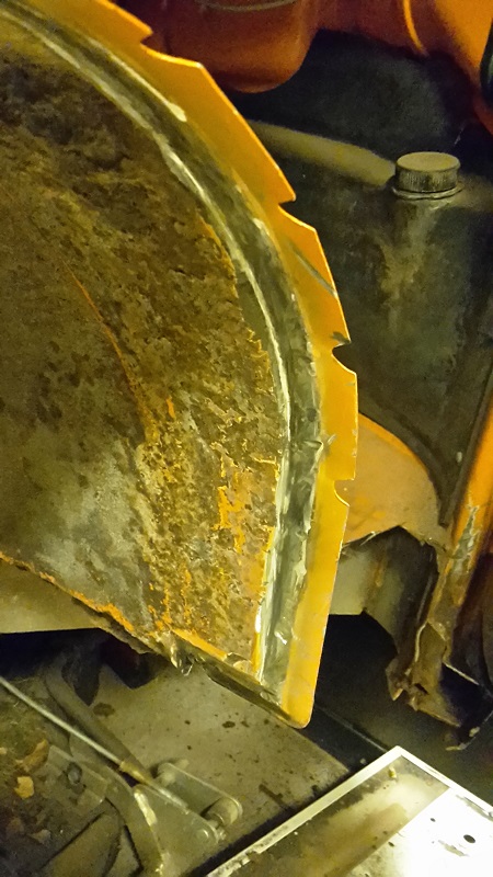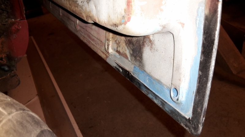 Bakom hjulen sitter det en invändig förstärkning en bit upp. Jag ville inte kladda med att skarva den också så jag kapade straxt under den.  På så sätt får jag färg på baksidan av svetsen. Rosten i falsen sträckte sig dessutom inte längre än så, så det blev en lämplig gräns.