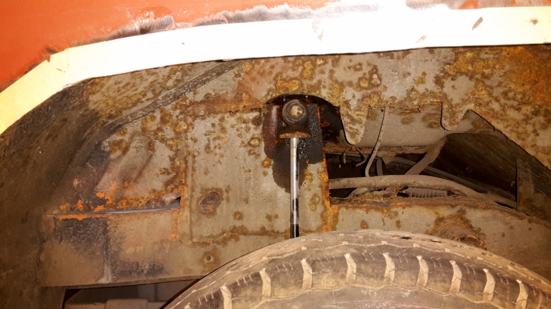 Dags för bakskärmen. Men först en viktig sak. När jag svetsade i motorrummet fick jag lägga igen en plåt som någon hade skurit upp i tankutrymmet för att komma åt muttern till bakstötdämparen. Med detta som ledning insåg jag att stötdämparens övre skruv kan sitta rejält fast. Och den är jävlig att komma åt med skärmen på plats. Därför passade jag på att dränka den i WD40 och sedan gick jag en match med slående elektrisk mutterdragare innan jag svetsade dit skärmkanten. Och voilá, den lossnade efter en stund.