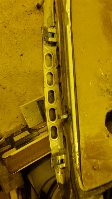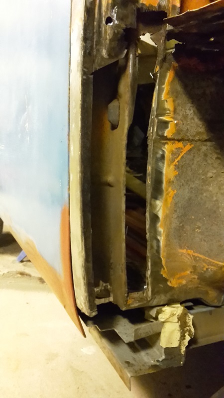 För att kunna passa in framskärmen bör man ha rätt dörrar inpassade på plats. Tyvärr var original-dörren lite angripen i nederkant. Konstigt nog inte den inre plåten utan bara yttersidan. Men jag chansar inte att blästra kanten och sedan lacka för att se rosten komma bubblande efter något år. Jag hade tur och fick köpa en frisk dörr av Micke Wärn (Veterania) här på forumet för något år sedan. Tyvärr fick VW av någon outgrundlig anledning för sig att byta gångjärn på dörrarna runt -75. Från 15mm sprint till 8mm. Man kan väl med stor säkerhet anta att ekonomerna var i farten?