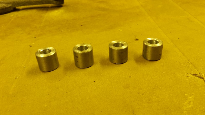 När man har knackat ur båda gångjärnen måste man ha bussningar för att ta upp skillnaden i diameter. Jag har hört att man kan borra upp gångjärnet till tidig diameter, men jag tyckte bussningarna var bättre eftersom man inte förstör något då. Sprinten är 15.02 mm. Jag hittade en slipad rundstång på 15.00mm, den fick duga. Upp i svarven och börja tillverka bussningar. Jag testade att borra hålet med en 7.9mm borr (det brukar alltid bli lite större hål än man tänkt sig, men sprintarna gick i för trögt så jag fick borra upp dem med en 8 mmm borr ändå.
