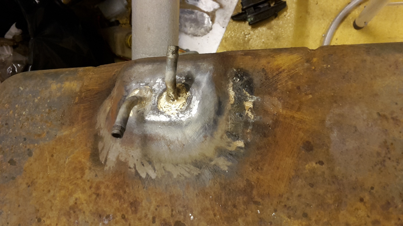 Det är två rör på min tank då det är en insprutningsbuss som behöver returledning. Båda rören slutar precis ovanför botten av tanken. Det är ganska lätt att råka löda ihop änden på röret så att det blir tätt och då får man löda loss och rensa. Gissa hur jag vet det....