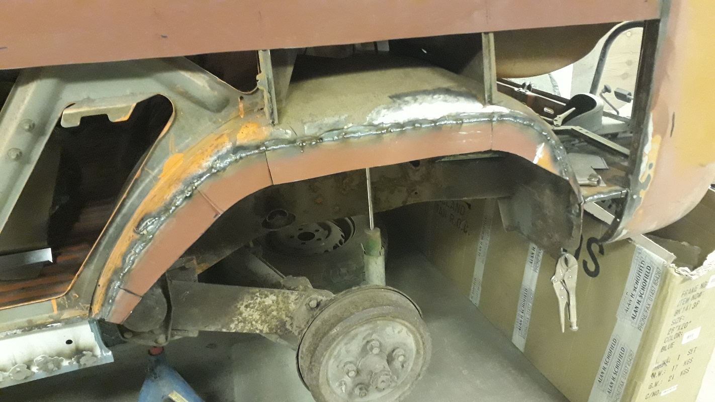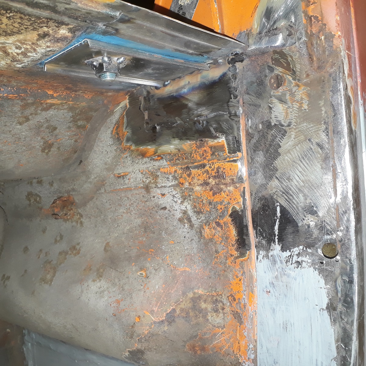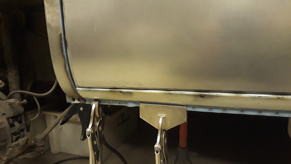 Jag köpte en ganska hög plåt ifrån Alan H Schofield. Den har en bockad kant längst upp. Tanken är att den skall gömmas inne i den invändiga förstärkningsprofilen, men hur fasen skall man komma åt att rostskyddsmåla då? Så jag kapade bort den. Originalets karossida kapades försiktigt igen så att kapskivan precis gick igenom plåten, men inte förstärkningsplåten innanför. Jag valde att inte limma denna skarv. Tänkte att förstärkningsplåten skulle hålla emot bra så att plåten slår sig vid svetsningen. Jag hade fel. Längs skarven höll det sig rakt, men plåten liksom bullade sig utåt ovanför och under svetsen. Men det är inga stora bulor, jag tror att det går att fixa med spackel inför lack.