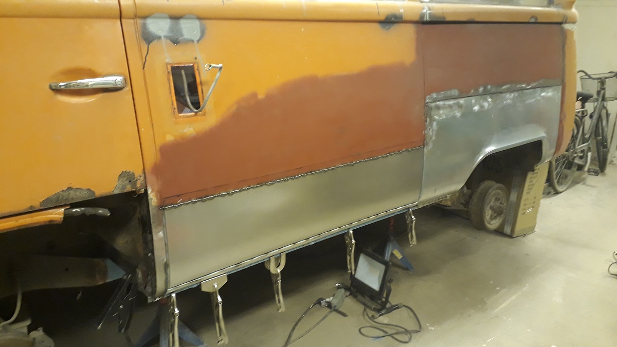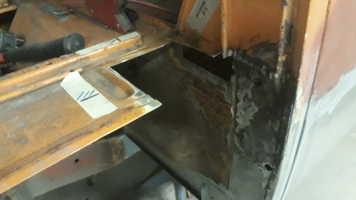 Nu lägger jag upp endast 3 bilder, men fasen vilket jobb det ligger bakom de bilderna.... Dags att svetsa dit karossidan mitt på bilen. Här gick det åt en del inpassning, det kan jag lova. Jag vet inte hur många gånger jag passade in plåten, bara för att sekunden efter ta ner den igen....