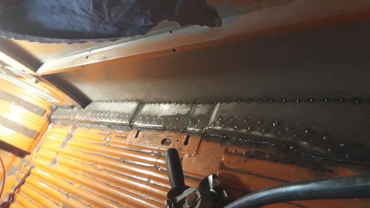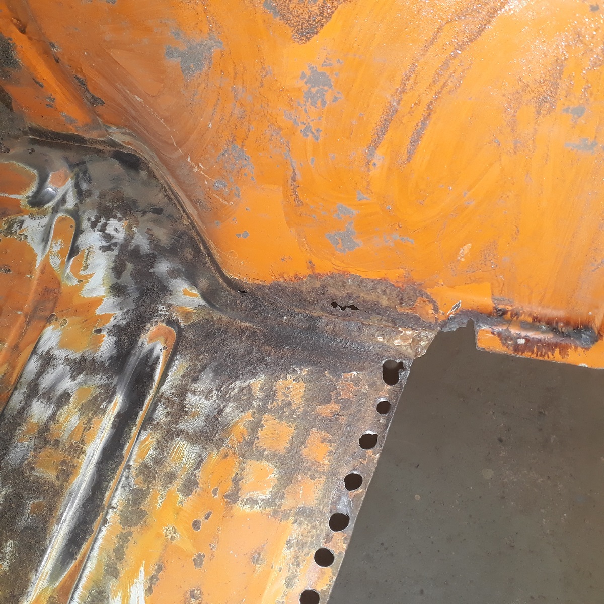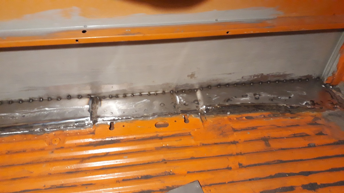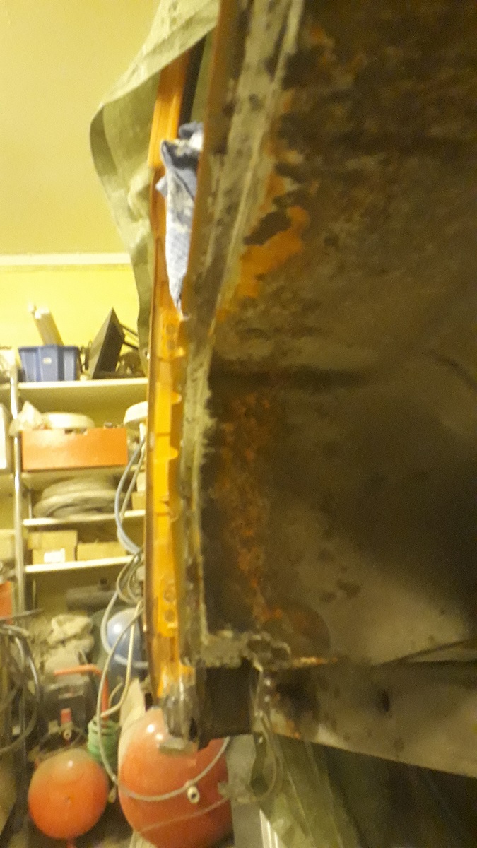 Undre yttertröskeln är lite lurig. Hur f-n kommer de åt att punkta den övre skarven på fabriken? Den är liksom gömd bakom tröskeln och under golvet. Jag har lurat mycket på i vilken ordning de egentligen svetsade dit bitarna på fabrik. Min lösning blev i alla fall att svetsa fast den mot karossidan innan karossidan svetsades på plats. Hade jag gjort det idag hade jag svetsat fast karossidan först och svetsat tröskeln efteråt uppifrån. När golvet är borta kommer man åt rätt skapligt. Nu hamnade tröskeln lite för långt ut kan jag tycka. Skitsvårt att syfta rätt.