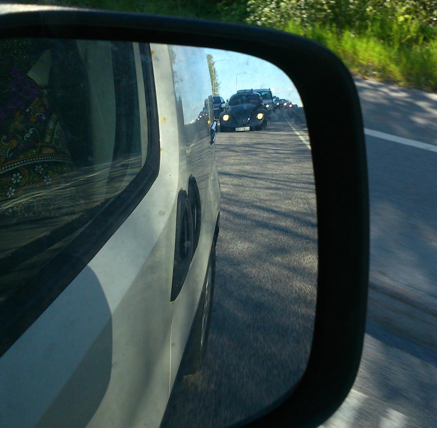 En par tre bruks 1303:or i Gävle och Sthlm, en bay panel i Gävle, en Bay DH på E4 utanför Uppsala, och kring Huddinge en Westfalia Bay, en 356 Speedster Replica och även denna gamle kändis som faktiskt lyckades fastna om än dåligt på bild. En taksänkt cal-looker på Centerlines med Asterix & Obelix lackat på sidorna. Nån som har mer info om den kanske ?  ICQ/ab