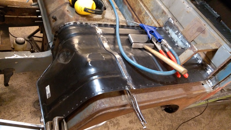Som jag nämnde förut så skulle jag som nästa steg börja med frontskinnet och allt där fram, men kom på att "sparkplåten" som golvet ska förankras i måste svetsas fast i framkant mot den främre tvärbalken vilket man kommer åt innan frontskinnet svetsas dit, och den kan jag inte sätta fast innan golvet är på plats ordentligt då den i detta nu är rörlig och lite formbar för att kunna anslutas mot golvet och dess kurvatur.