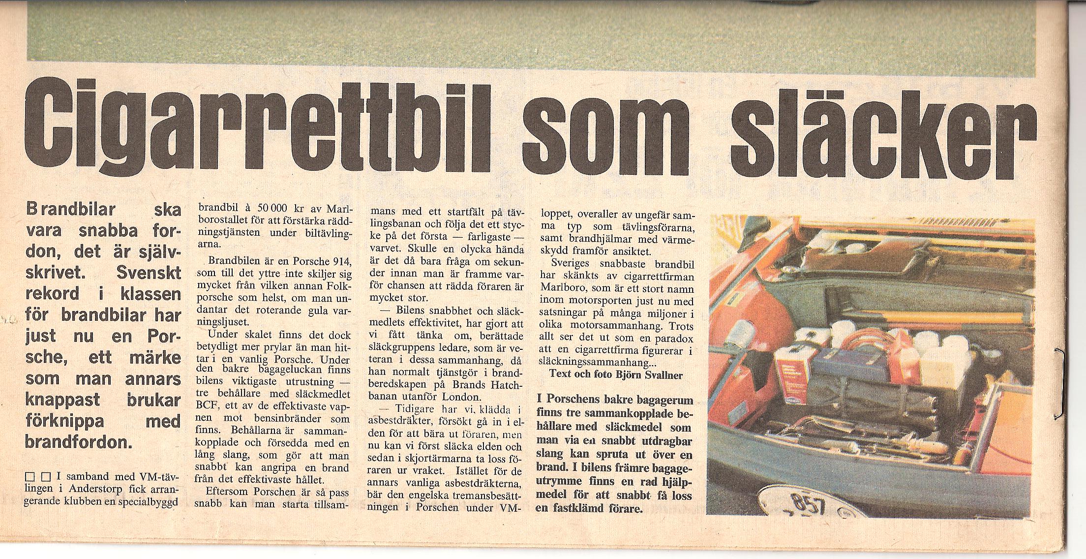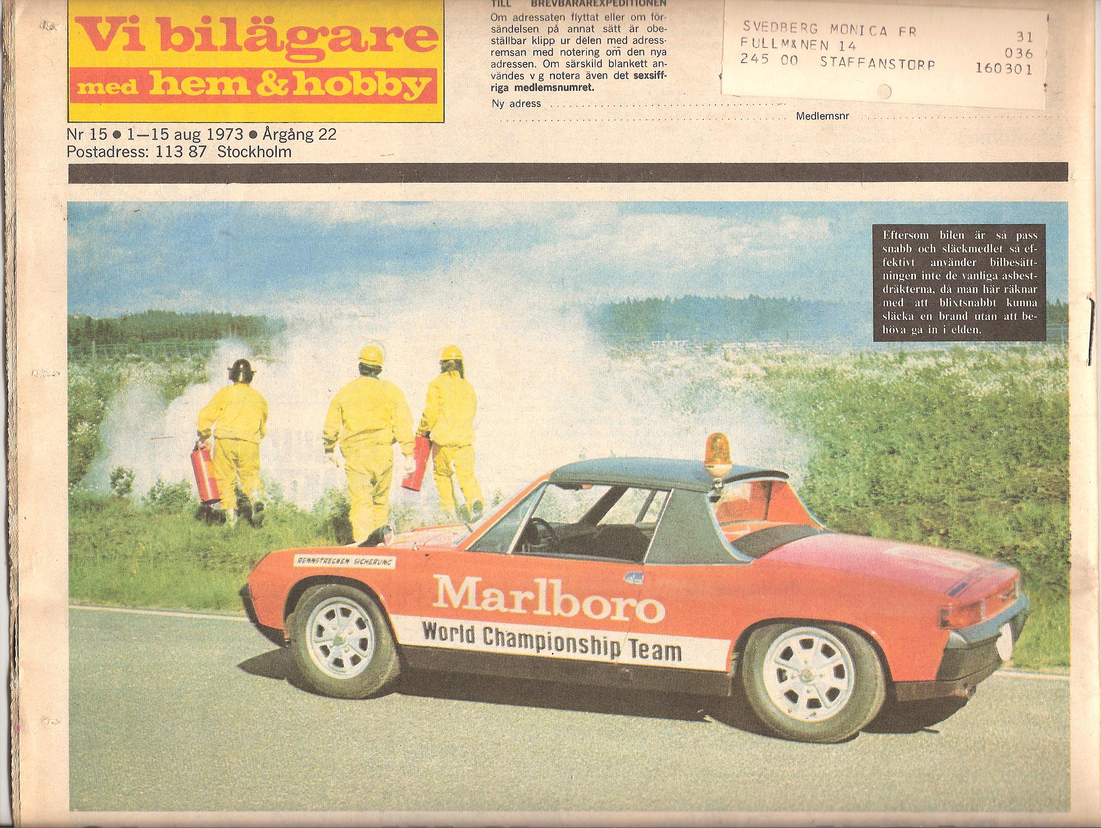 Bilen skänktes av Marloboro och Clay Regazzoni efter att själv blivit bränd i en F1 tävling året innan. Alla F1 banorna fick en 914 bil av Porsche & Regazzoni tillsammans med hans sponsorer, så tex. i Tyskland och Nurburgring var det Recaro, men i Sverige var det Marlboro som hjälpte till.