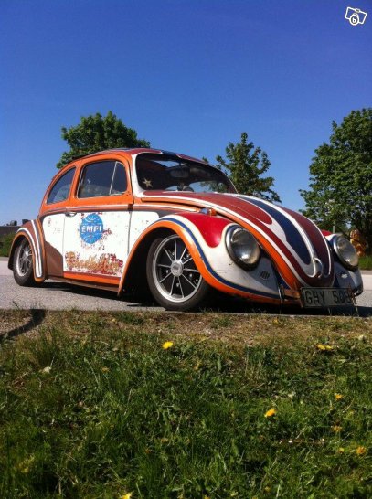 , BRM fälgar 5,5tums bak, 4,5 tums fram, 1600 dubbelports motor med portade toppar, ormbo Empi hideaway med dubbla utblås, Ny koppling (lamell, tryckplatta) Nytt soltak ifällt för ca 2,5 år sedan med nytt blått vinyltak, stolar klädda med original tillbehörs överdragsklädsel röd/vit med guldiga kederlister, innertak och sidor filtade i mörkgrått tyg, dörrsidor tryckta med Empi motiv på vinyl både fram och bak, ombonad och fin. Passagerar sätet ombyggt så du kan bygga om till säng på några få minuter=slipp tält på VW träffarna, allt i bromsväg nytt, nya tänddelar i motorn,stor varvräknare (urkopplad för tillfället),klädd hatthylla bak! Varit med i 3 sidors reportage i tidningen Gasoline, Utställd på Elmia 2013. Listan kan göras lång. Besiktigad till April 2014. Det är med stor tår i ögat jag säljer den men kan inte behålla allt pga plats. Köper du denna bil är du garanterad maxad uppmärksamhet och måååånga blickar både på träffar och i trafik.