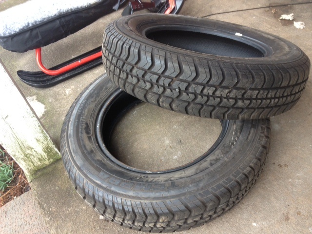 Två stycken 165R15 något grovmönstrade. Mycket mönster kvar. Mjuka och fina. 500:-