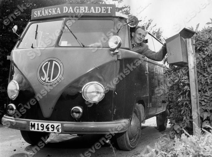 SkD Skånska Dagbladet i Malmö 1952. Tidningsbilen VW Volkswagen buss.