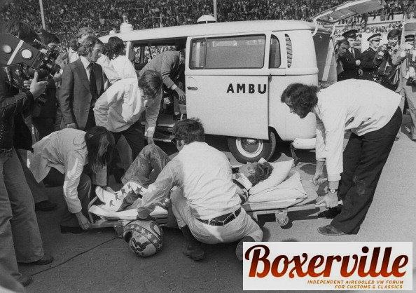 Evil Knievel får åka vw buss till sjukhuset efter att ha hoppat över 13 bussar -1975.