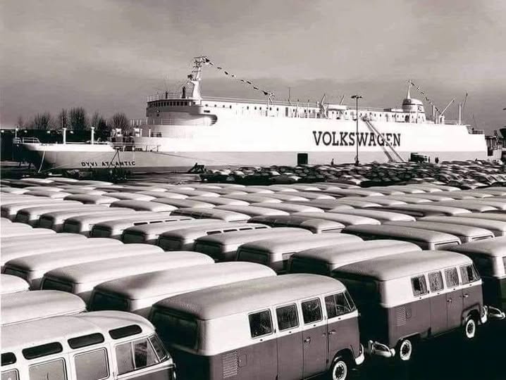 Sikorsky S-64 Skycrane-helikopter som transporterar Volkswagen bilar på en flygmässa i Hannover i början av 1960-talet.