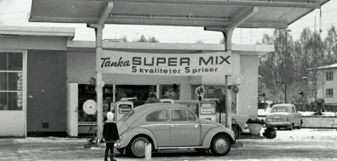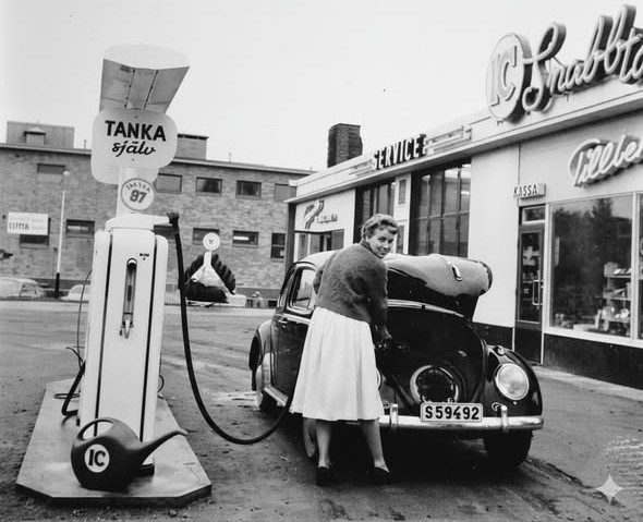 Esso-bensinstationen låg vid Polhemsplatsen fram till slutet av 1960-talet eller början av 1970-talet, då den revs. Byggnaden i bakgrunden är troligen det som idag är en del av bebyggelsen kring platsen, som ligger centralt i Göteborg nära Centralstationen och Nordstan.