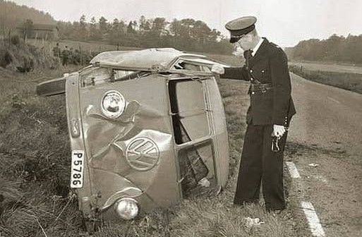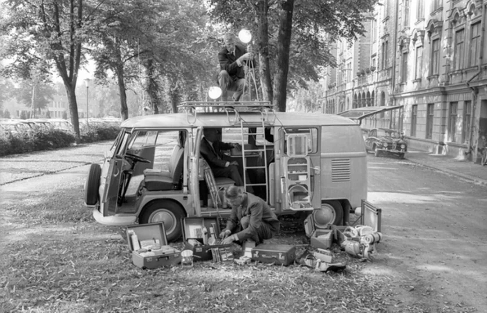 Artikelns bildtext: "Ett belysningsaggregat som lämnar 1kw ingår i utrustningen. Det används för belysning av brottsplats nattetid och monteras lämpligen på biltaket. Fyra lampor kan anslutas. På bilden sköter polisman Roland Svensson aggregatet medan kriminalassistent Åke Fahlborg mixtrar med 'blodväskan'.