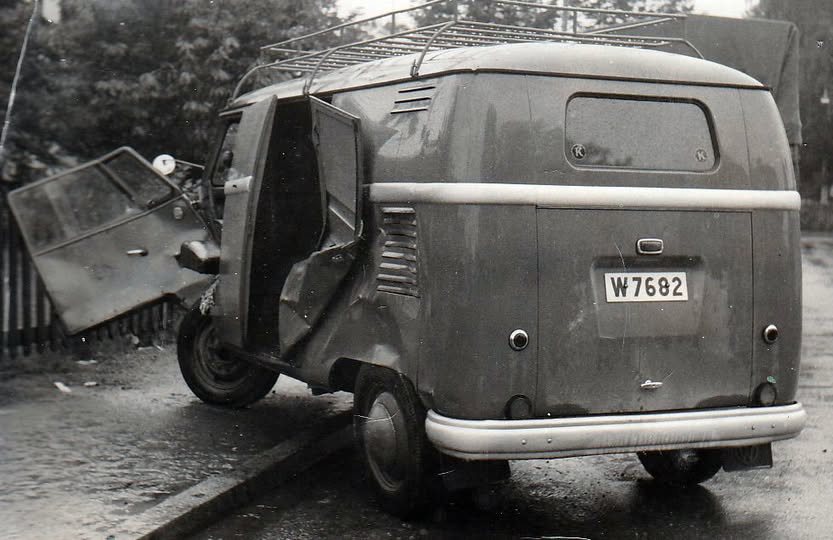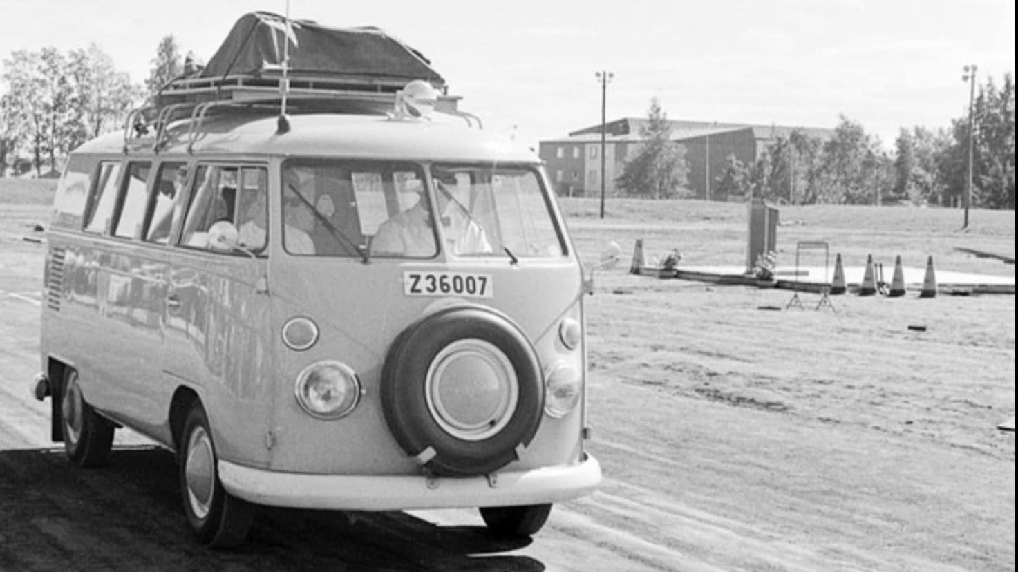 Det ser ut som i Falkenberg, det är idag Restaurang Gustaf Bratt som man ser i bakgrunden, så VW-bussen med skåneskyltar var nog på celebert besök i N-länet.  https://www.gustafbratt.se