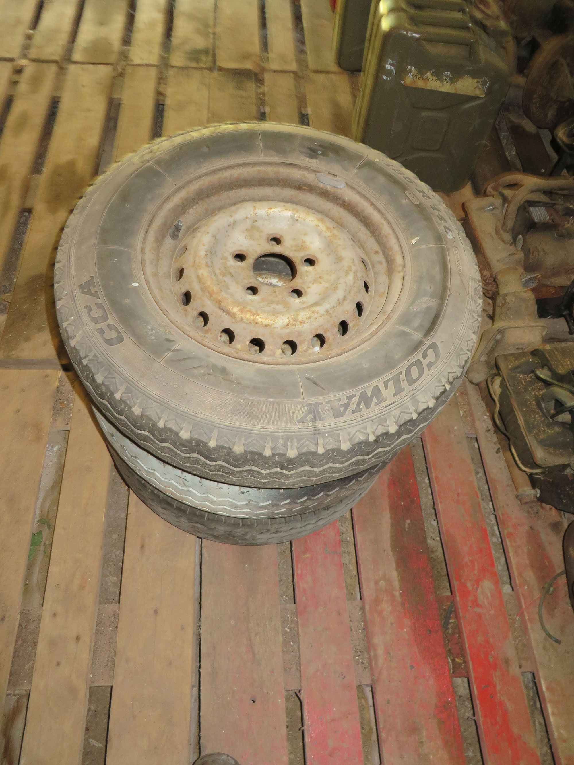 Däcken går att köra på men är ganska torra och gamla. Fälgarna är rätt rostiga men går att få fina efter lite blästring.