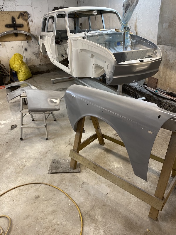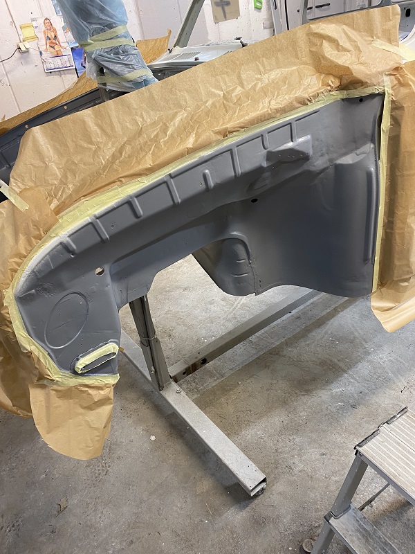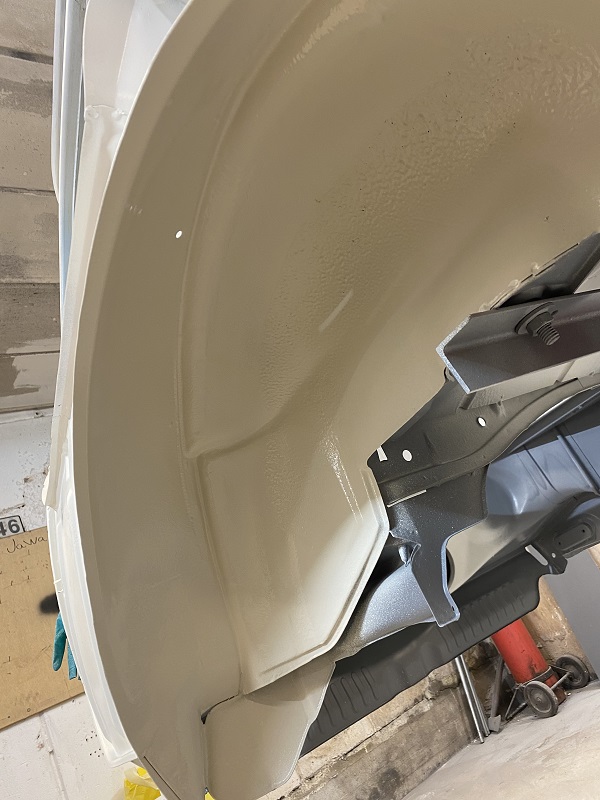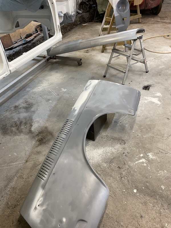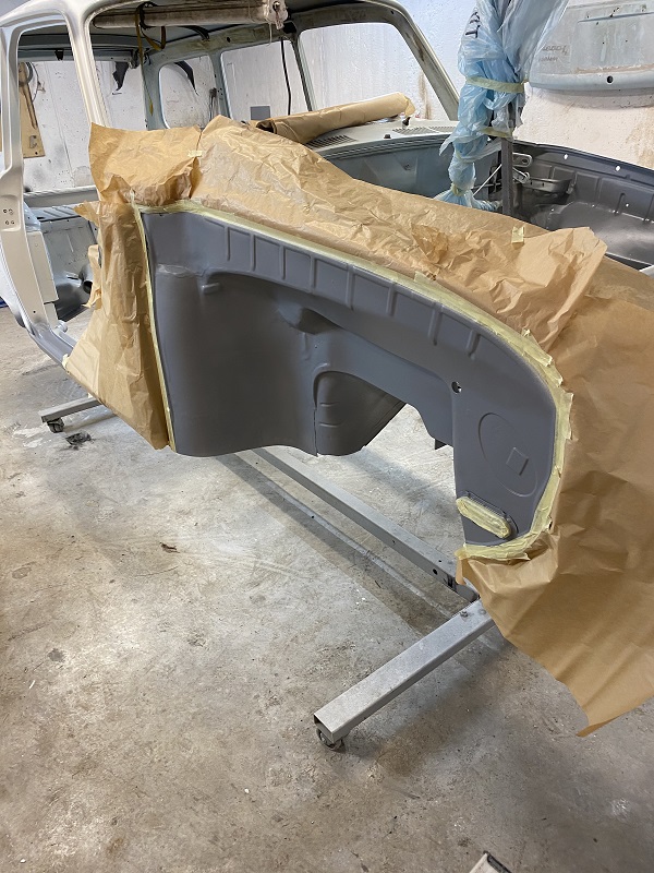 Efter jag smetat ett till lager Epoxy i hjulhusen och innerskärmar blev det ett lager body.