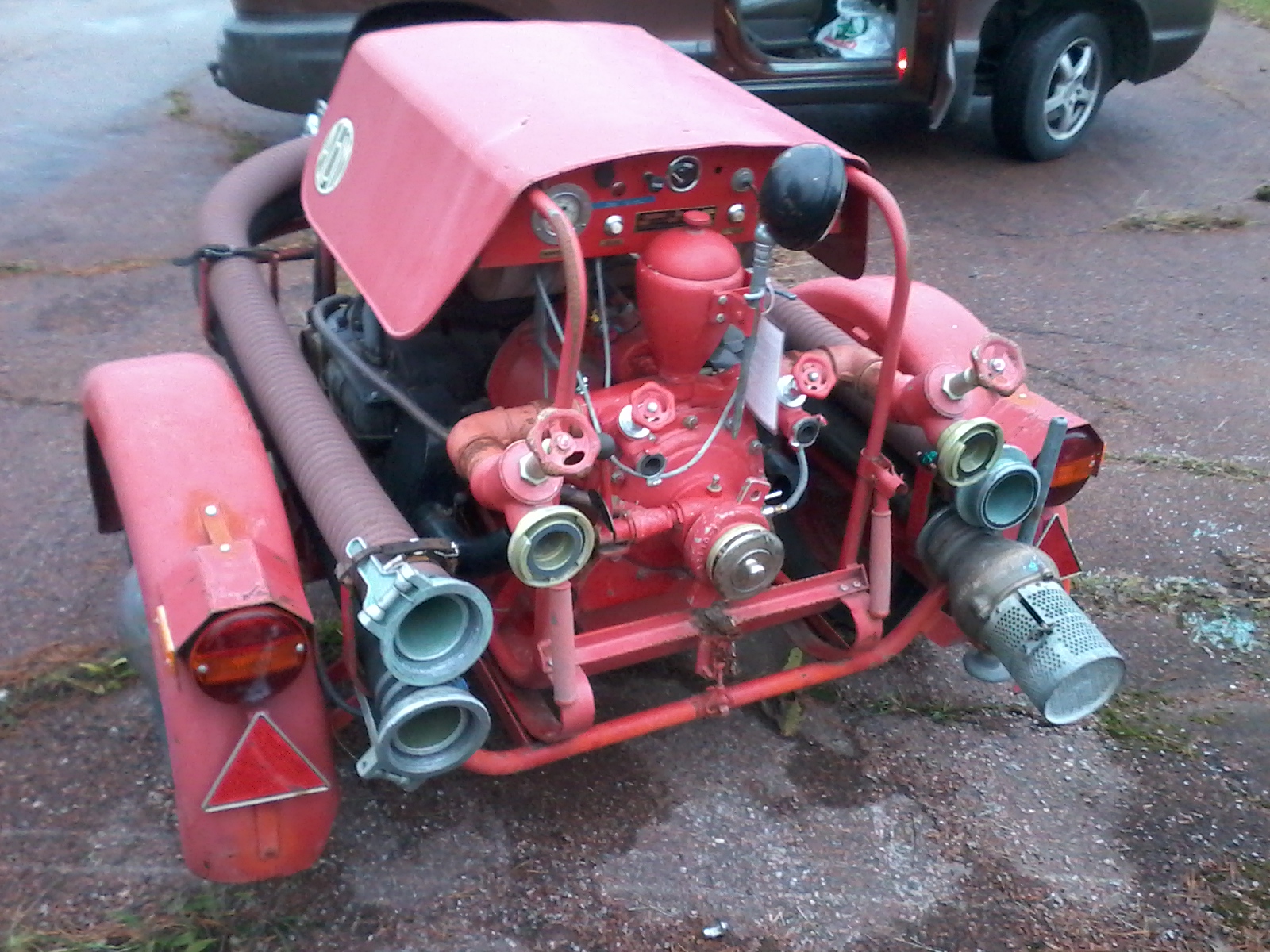 Jag har ingen vagn, men en släde med pump, som jag lovat bort till det frivilliga brandförsvaret vid sommarstugan... De kör varje sommar en liten demonstration av sina grejjor, då brukar jag kolla på deras pumpar... De ville gärna ha reservdelar, då denna pump fortfarande är viktig (vad jag förstår) ute i skärgården där brandbilar inte kommer fram men det är gott om vatten i närheten...