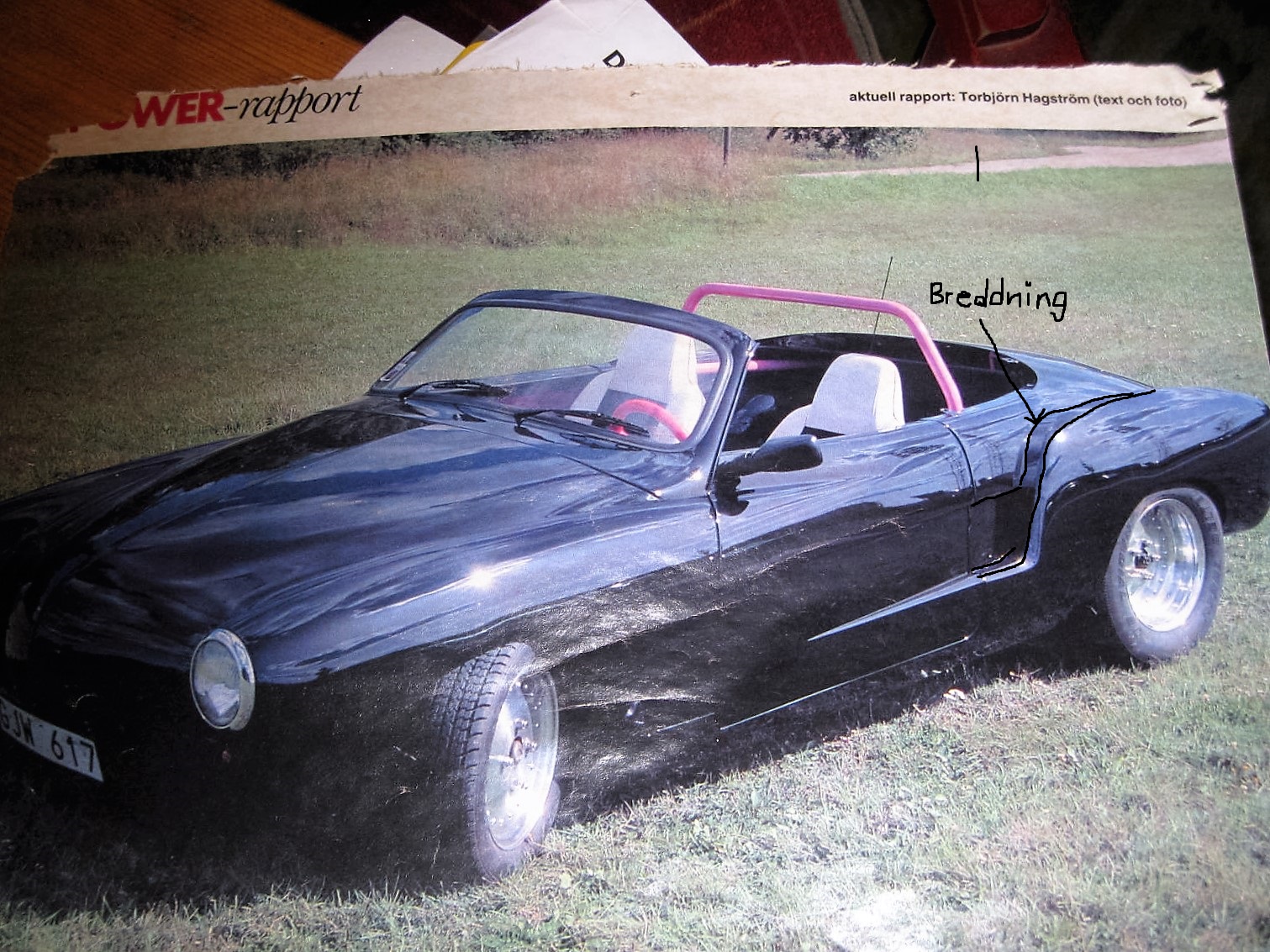 hej du klurar ju på hur du skall bredda ghian bak här är några bilder på min 67a som jag byggde om på 90talet ,sågade isär bakskärmen o flyttade ut den bak så den hade samma bredd som fram vid b-stolpen hela vägen bak (blev en kil hela vägen) o sen lyfte jag upp den lite grann , jag åkte med 8 tums fälgar bak med 275or ,den blev totalt 20 cm bredare bak, sen blev det luftintag på sidan sänk rutram plast flipp (form finns kvar)+ motor lucka i plast, Det kanske är någon här på forumet som vet var den finns har inte sätt den på länge