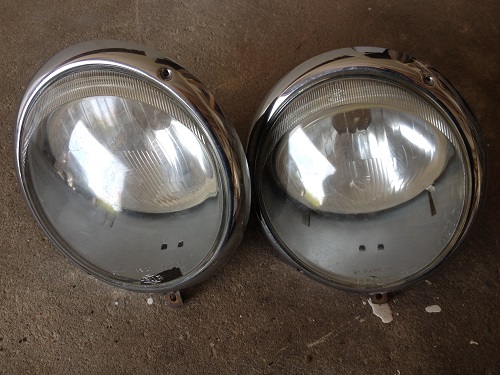 Råttiga original USA-lysen, fina kromringar och insatser (Marchal). Hella glas på ena och VW-märkt glas på det andra. Den ena är lite granna sönderrostad i huset men fullt funktionerande och ger ändå ett gott intryck. Finns inte uttag för p-ljus.
