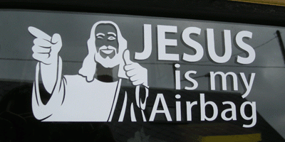 En text som te.x "Jesus is my airbag" kan man lätt få använda...