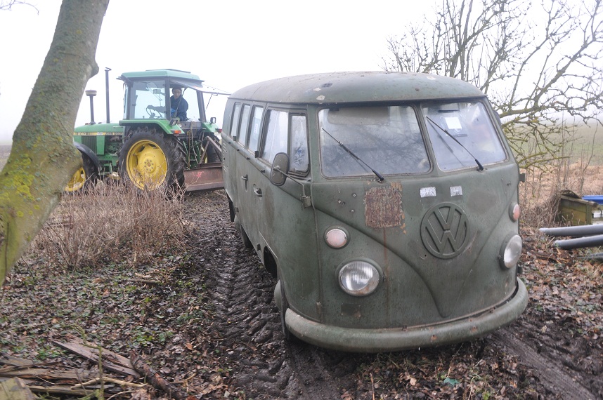 Några omtag, i och ur med luft i däcken och några trånga passager sen såg den ljusskygga bussen åter dagens ljus och solen gnistrade i lacken.  Nä det kanske inte gnistrade så mycket men å andra sidan uppenbarade sig inga rostangrepp på bussen när den väl var ute så vi kunde granska den. Nu återstod att lista ut vart vi skulle sammanföra bussen och biltrailer. Som jag tidigare nämnt så var bärigheten i marken inte vad man kunde önskat men med traktorns hjälp fick den ta en tur för att sträcka ut alla stela leder och motionera bromsarna lite.