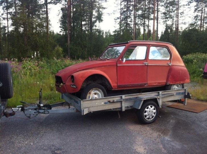 Lösningen är en Citroën Dyane 6. Från 1968. Då damerna var snyggare, bilarna var fränare och slipsarna var smalare. Första, mycket ovanliga årsmodellen med de rättvända dörrhandtagen och vita dörrinnersidorna. Fyra individuellt upphängda hjul med extremt lång fjädringsväg. Instrumentering utan onödiga finesser och en smäcker växelspak som kommer ut som ett rymdskepp rakt ur panelen. Givetvis manövreras startmotorn med dragwire. Startmotor medföljer utan extra kostnad. Kontraviktsstötdämpare fram.