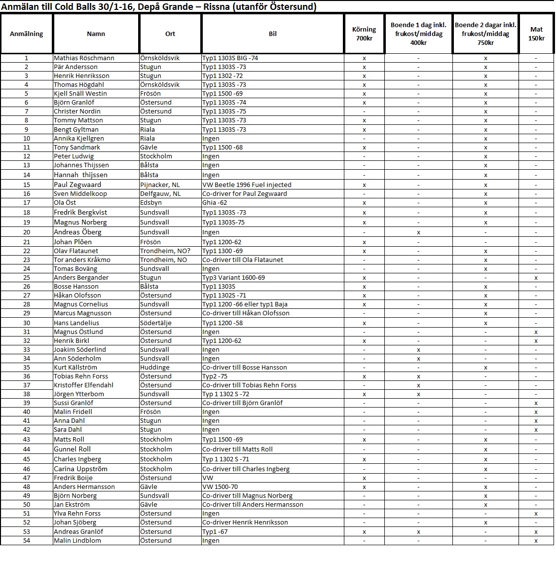 Ni som har anmält er, kolla så att ni finns med på listan och att jag har prickat för rätt alternativ för er. Meddela mig om något är fel.