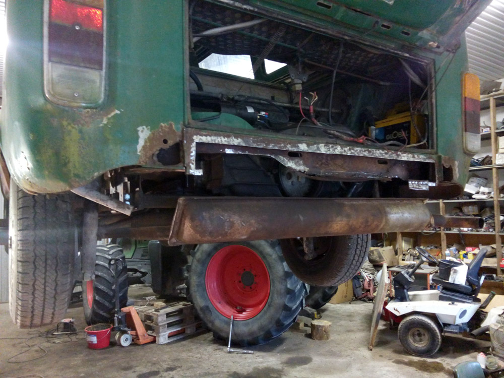 Då var det dags för att se vad som fanns kvar av bakändan... Satt dragkork på, en ganska kraftig balkhistoria. Skall istället återmontera kofångare bak som jag hittade i det höga gräset en bit från bussen...