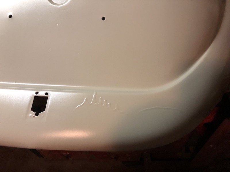 Hålen var igen spacklade och frågan är om det har suttit något emblem där och i så fall, hur såg det ut?