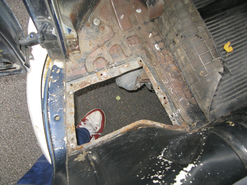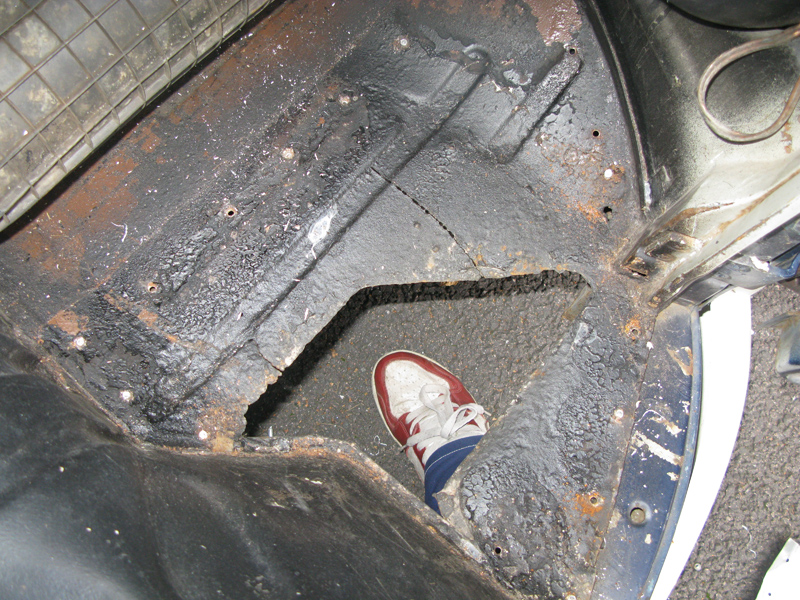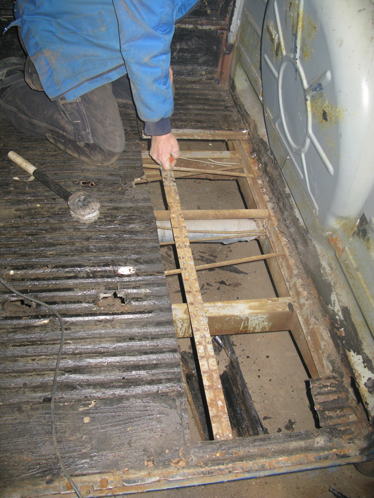Rosten fanns i golven. Både i lastutrymme och kupé. Det var en hel del glasfiber, popnit och tuggummilagningar. Det som är bra är att det är inte helrötet, det finns att fästa i, och att balkar och utriggare är friska. Och dom har kapat bort värmeröret i bak. Om någon har ett till salu så skicka pm till mig.