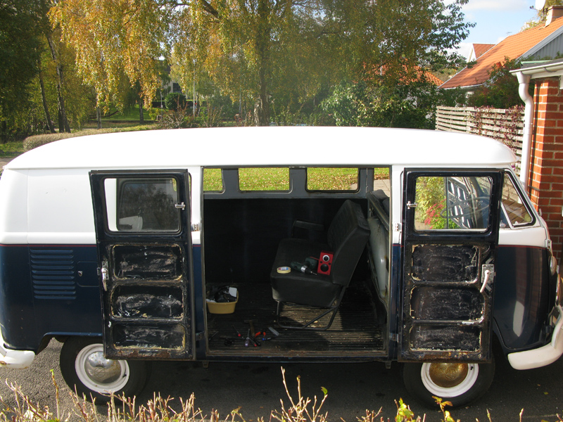 Idag har jag rivit ut den gamla inredningen som gick i blått i en härlig plysch. Den var hel men ganska solblekt. Hittade inget kul... mynt, gamla lappar eller röka (den kommer ju från Woodstock!).