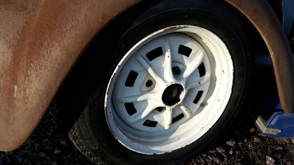 Ja, stämmer framvagnen är avsmalnad. Nu sitter det originalspindlar på. Sväljer 5,5 tummarna med 165x15 bra. Skulle nog se smalt ut med 4,5. I bak får det bli lite mer däck kanske så stort som 185:or. Finns en bra skrot mellan Tidaholm och Tibro. Dit kan man åka och "labba" lite. Karmann67 tog ett mått på höjden. Känns körbart:-)