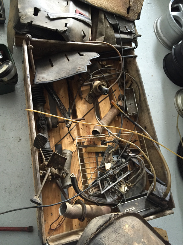 Sedan var det ju lösa delar i lådor. Om jag hade kunnat då vad jag kan nu så hade jag ifrågasatt en hel del. Det var ju såklart en hel del som fattades. Det var också en hel del som var helt fel. Det var också många delar som var skrot. Jag skulle nog säga att det var 50% av alla delar utöver kaross, motor och växellåda som var med när allt skräp och felaktigt sorterats bort.