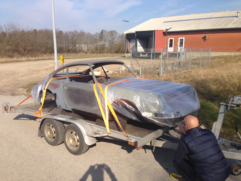 Nu har det alltså gått drygt tre år sedan jag var och hämtade objektet i Danmark. På bilderna ser ni lite av vad jag fick med mig. Det som jag själv kunde se vid det tillfället var att karossen hade fått en hel del jobb gjort och med många nya bitar. Svetsjobb såg bra ut, det enda karossmässiga som jag ej fick med var främre kofångaren. Jag köpte en kaross, en motor, växellåda och en hög med övriga delar. Säljaren sa att det var 90% av alla delar.