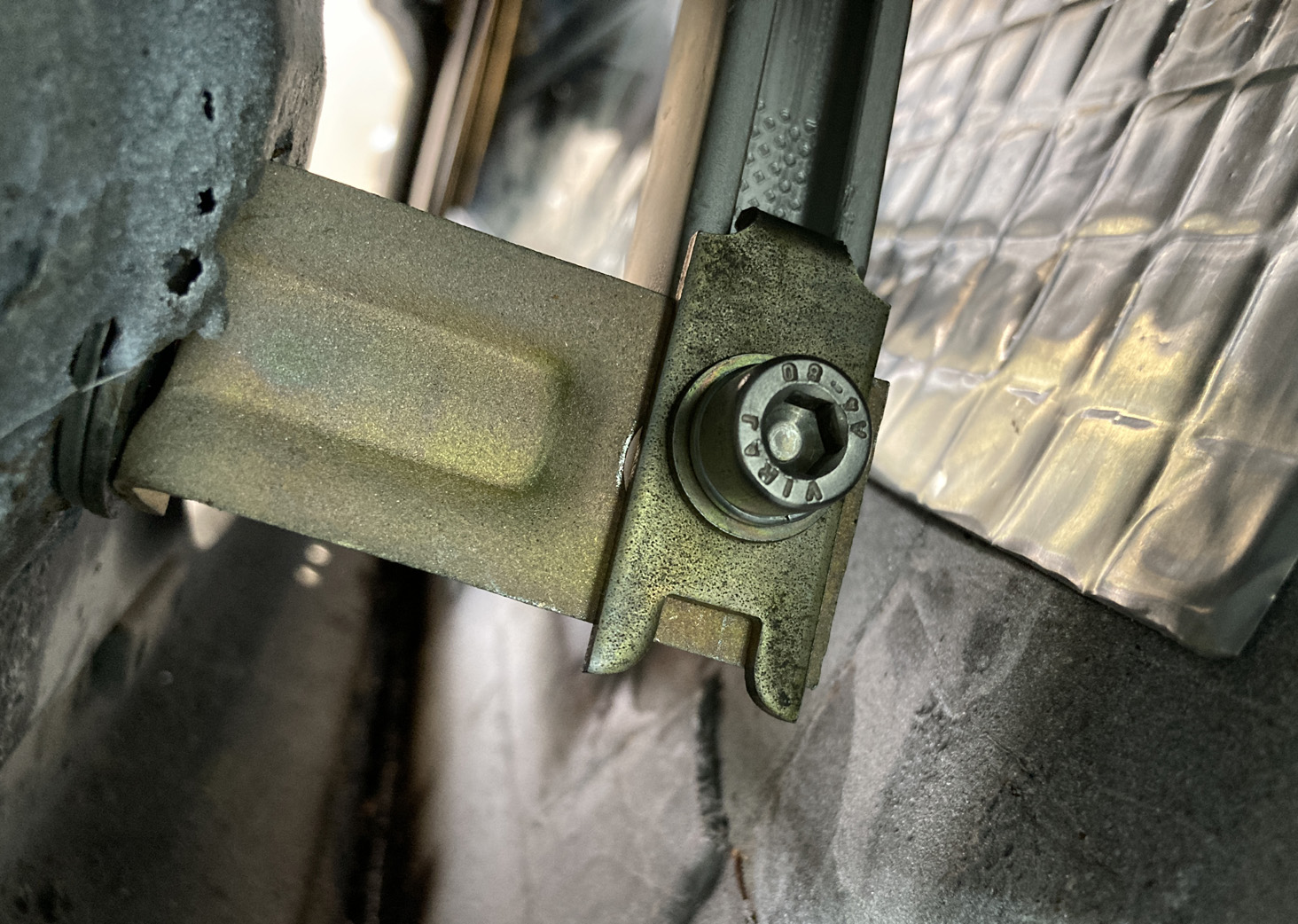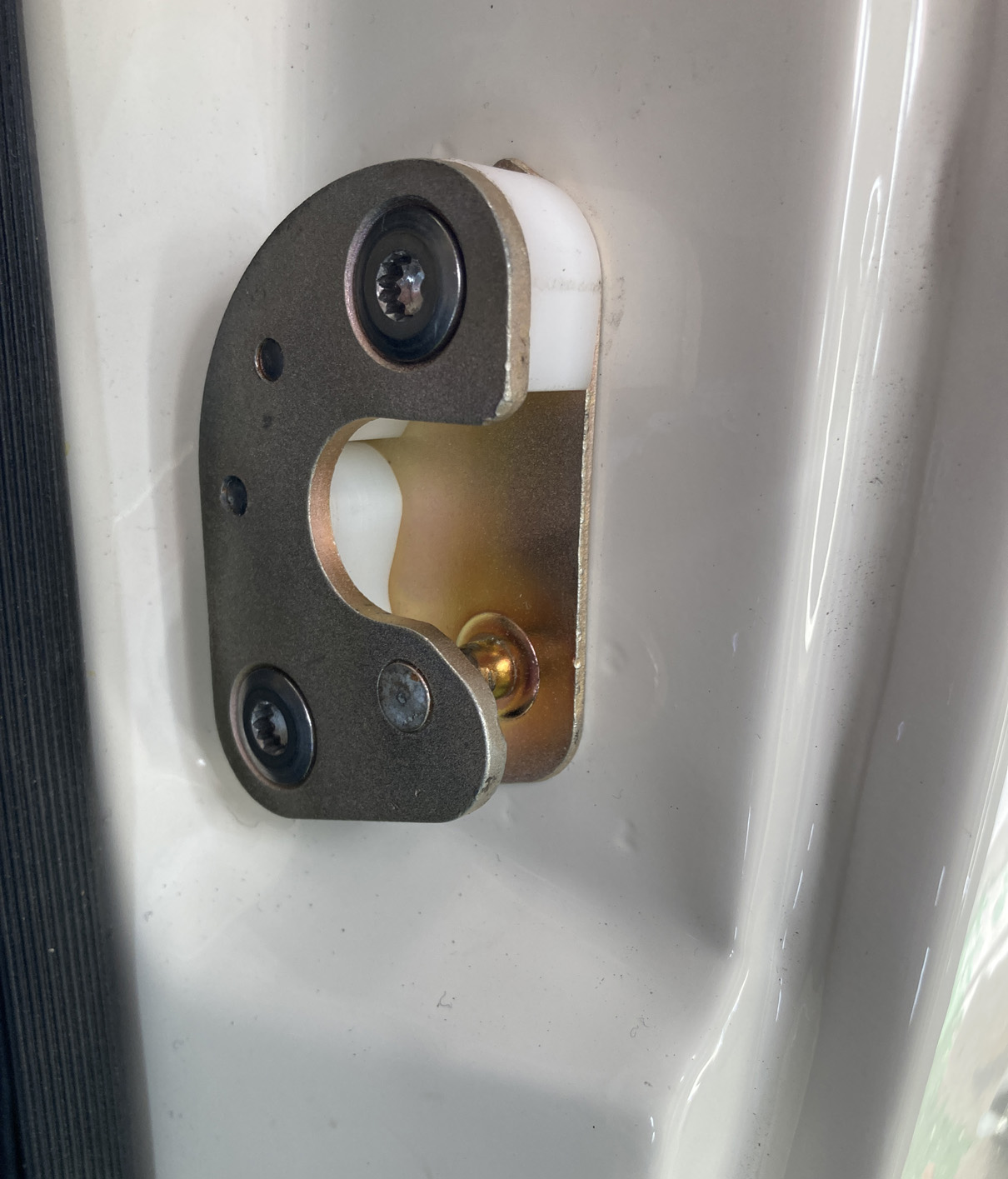 På b-stolpen sitter låsblecket. Det har jag renoverat med nya plastdelar då de gamla var helt slut. Gulkromaterat och med friska bultar så blir det som nytt! Om man behöver så hade jag shims att sätta bakom. Två olika tjocklekar. På högersidan använde jag båda, på vänstersidan inget.