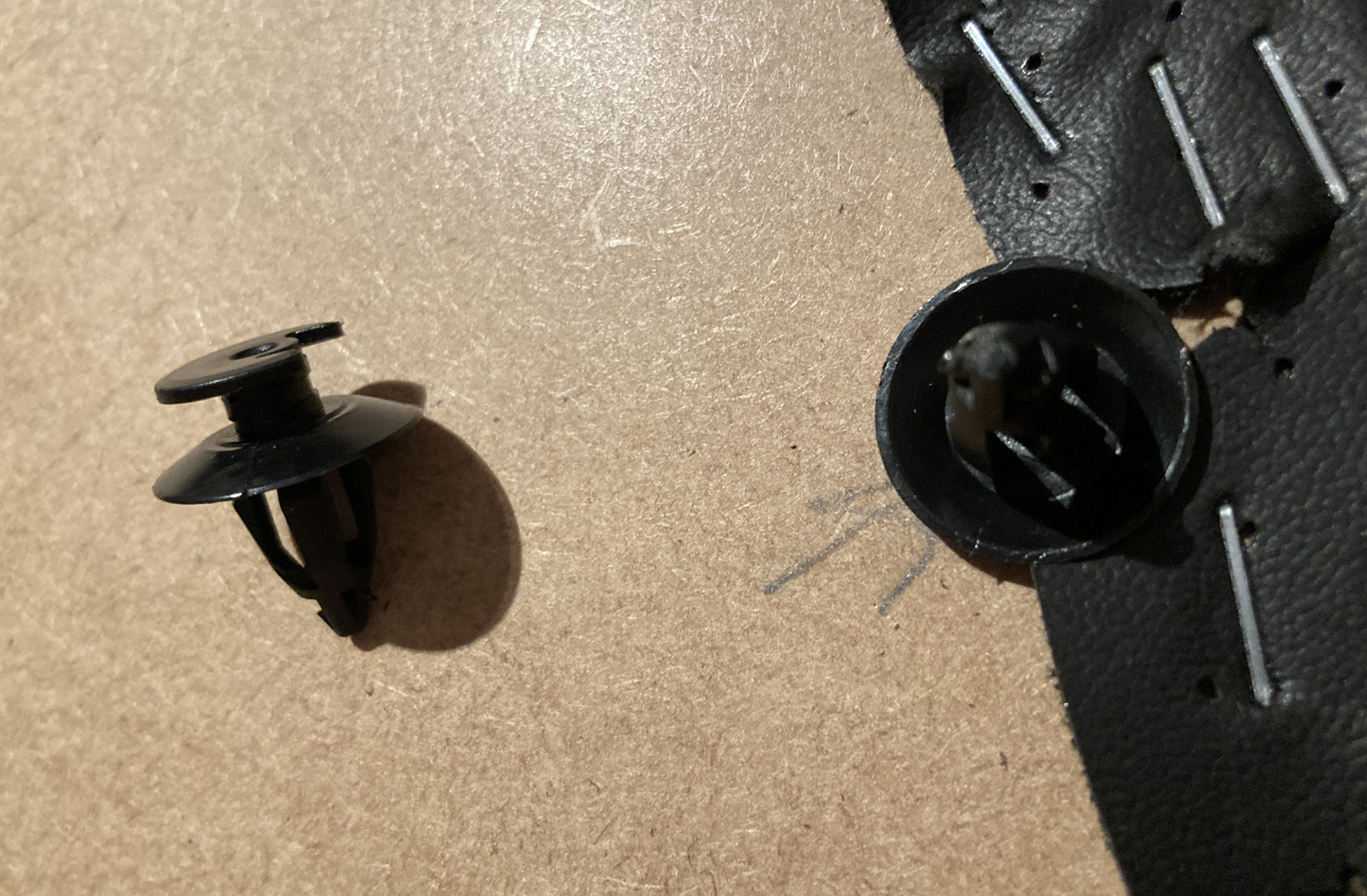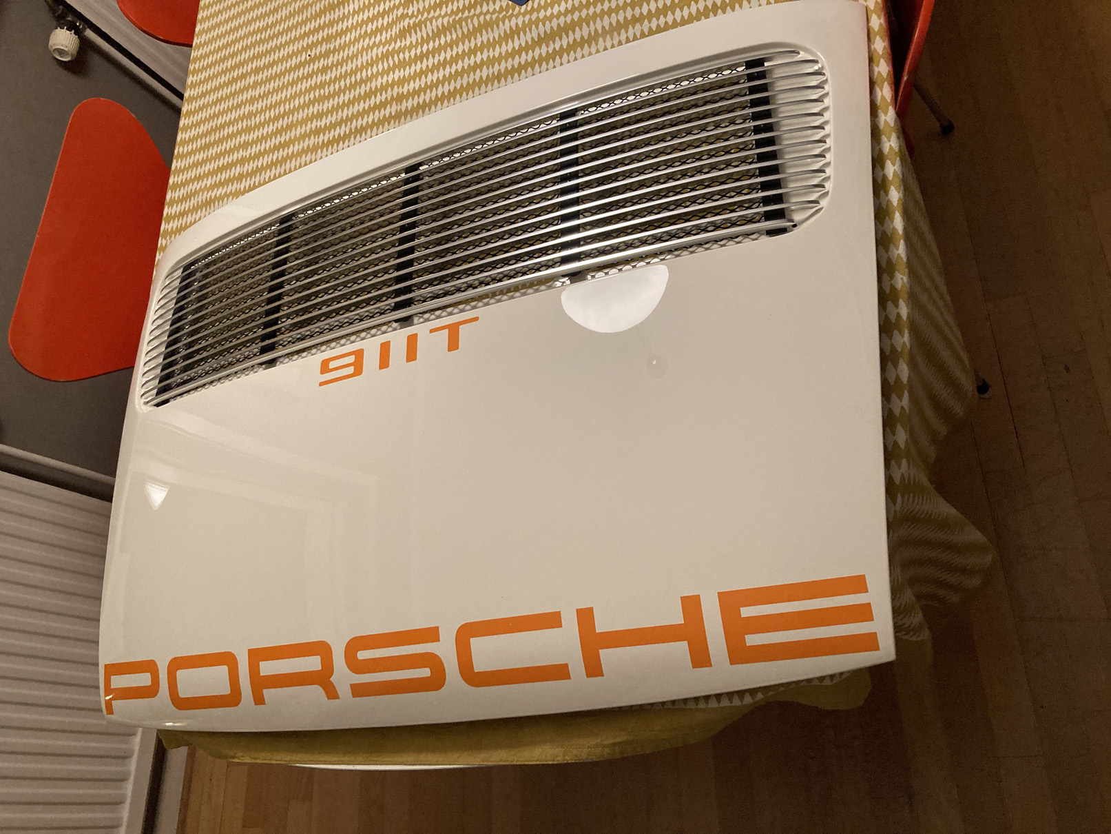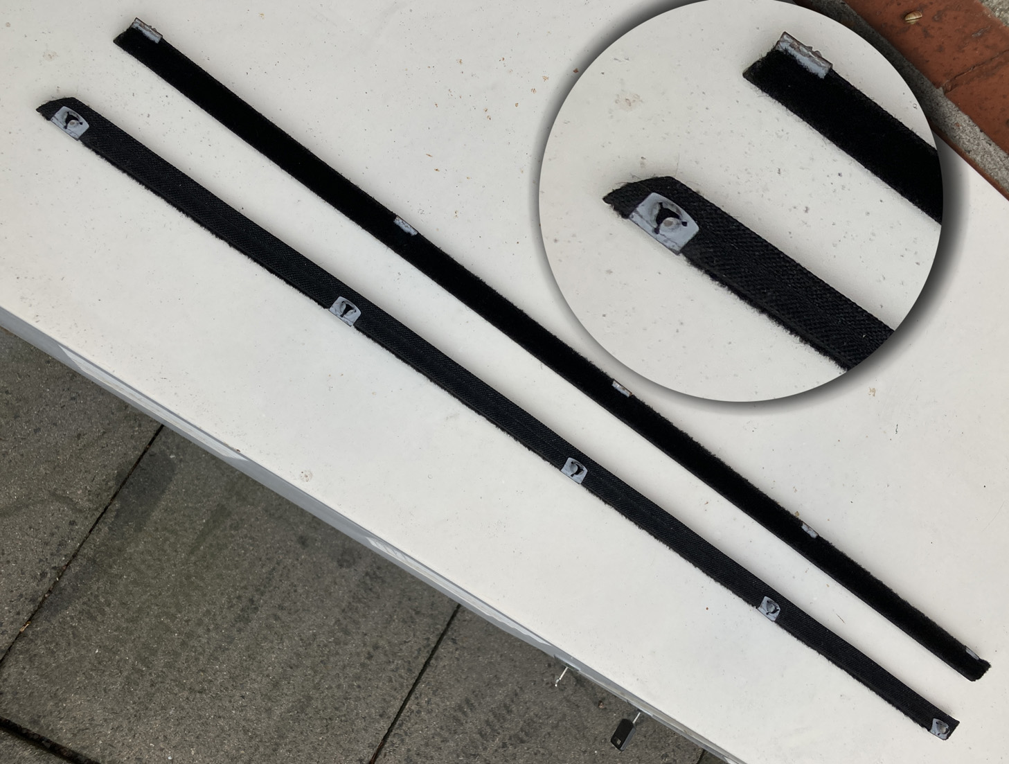 Klurade på hur jag skulle fästa dem. Kollade i lite kataloger från nyare Porschar (än min) och hittade några fästen som skulle funka. Tre stycken breda i underkant och en liten "kub" i fram och bakkant. Fick modifiera de undre genom att ge dem lite vinkel så de låg an glasfiberpanelen lite bättre. Satte bara en kub i framkant då jag kunde fästa i handtaget i bakkant.