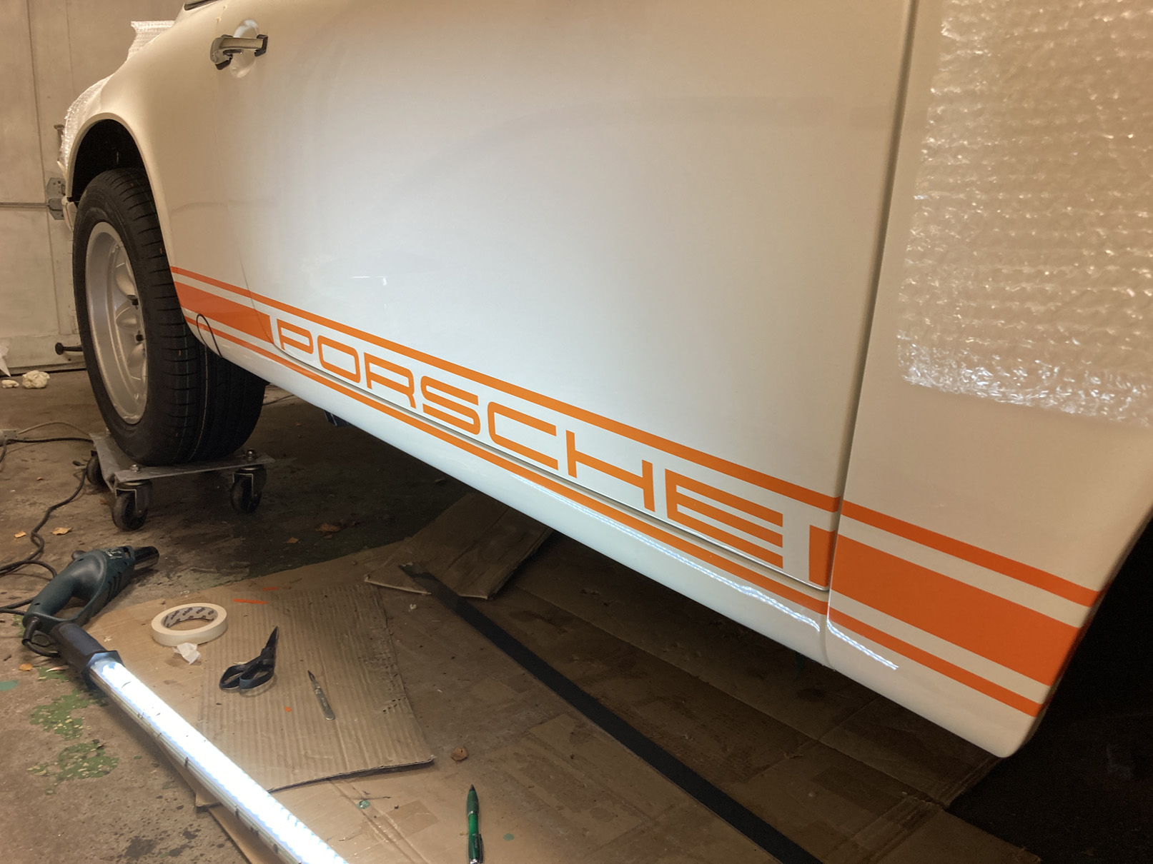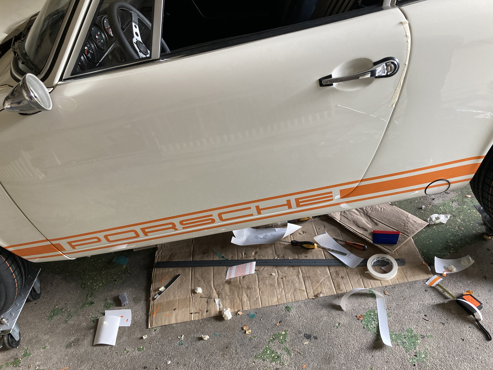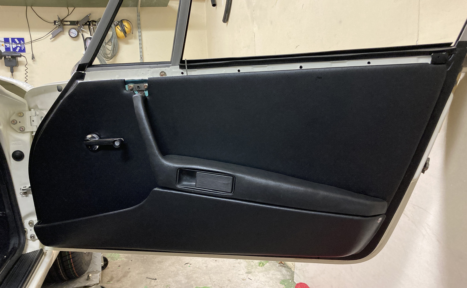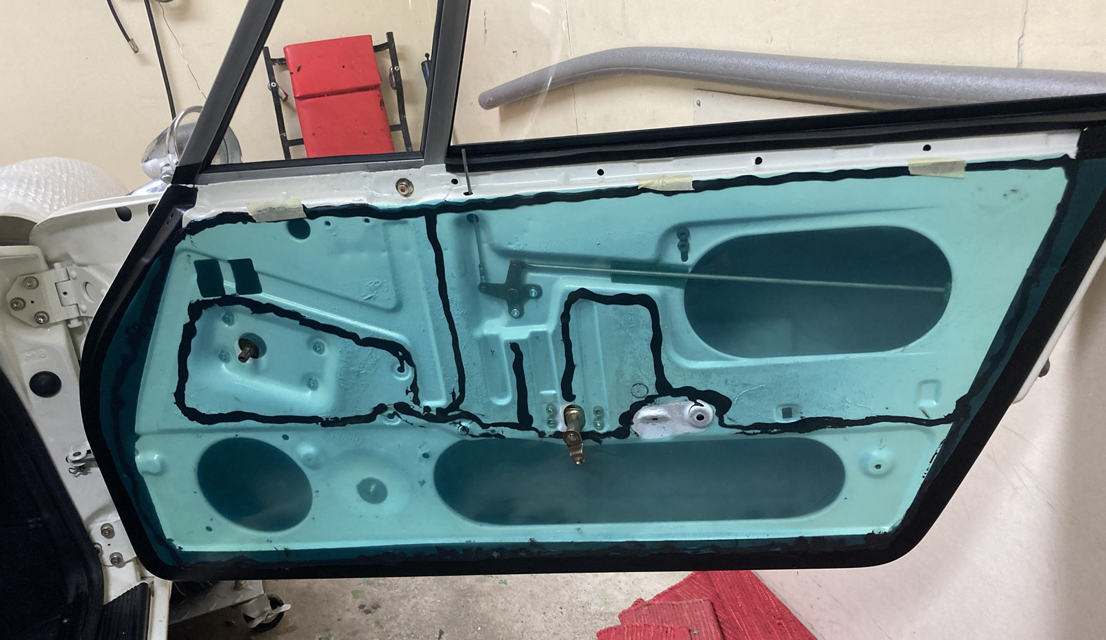Det ska ju sitta en fuktspärr i tunn plast mellan dörr och panel. Det finns ju såklart att köpa Porsche original för 500 kr per sida, men jag skar till egna av åldersbeständig fuktspärr för husbyggen. Jag norpade några meter från min kompis som håller på att renovera.