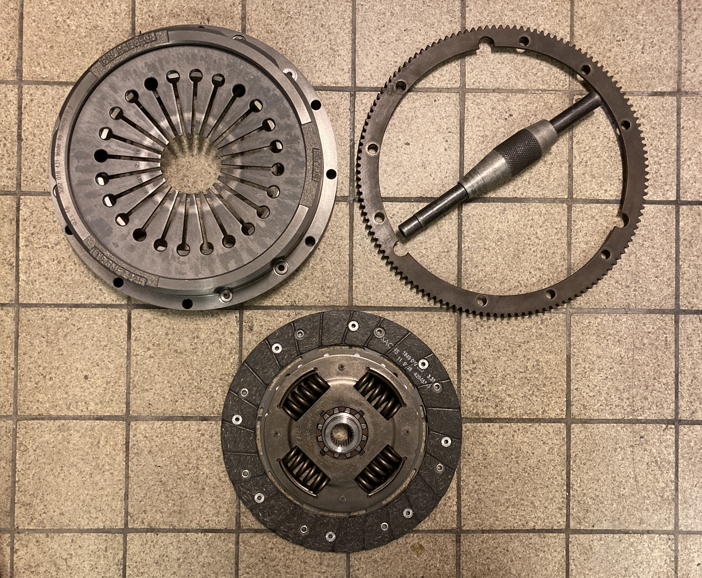 Delarna som det gäller är: startkrans, tryckplatta, kopplingslamell, svänghjul och urtrampningslager. På bilden ser ni också ett centreringsverktyg som man behöver för att få lamellen i rätt läge när man drar fast tryckplattan.