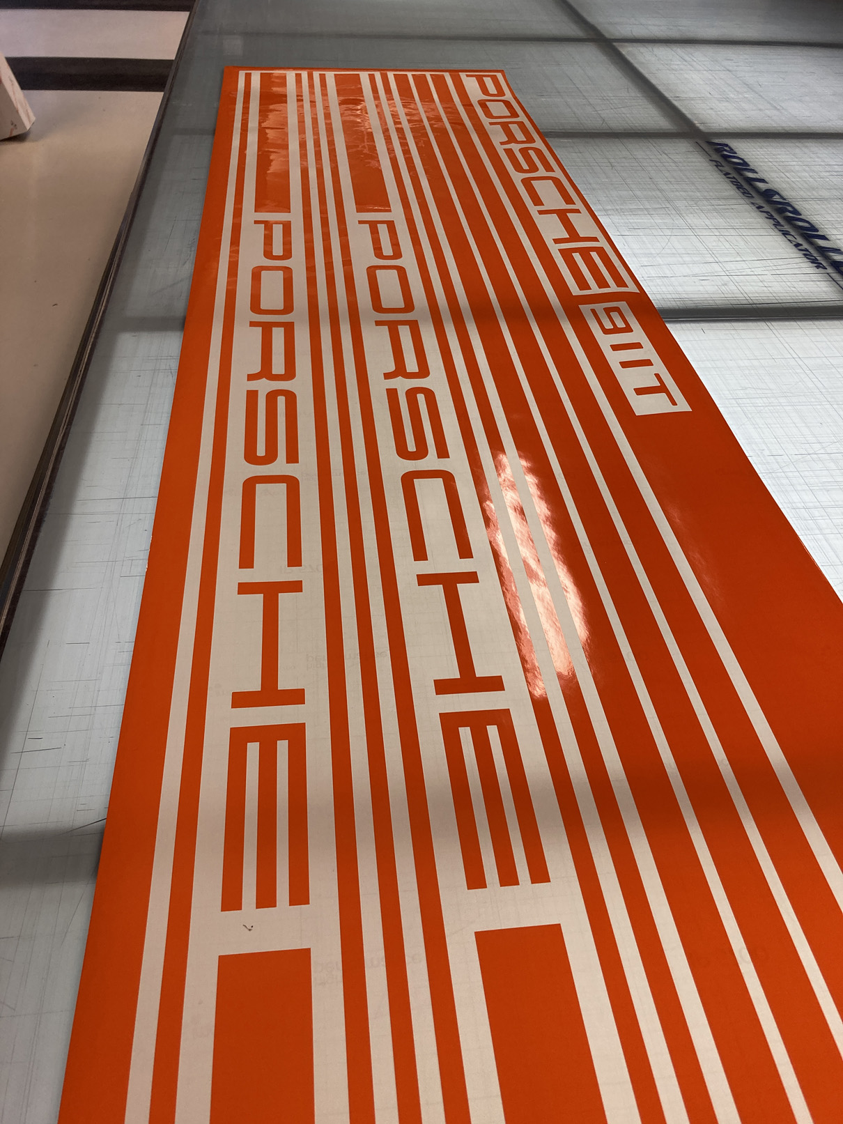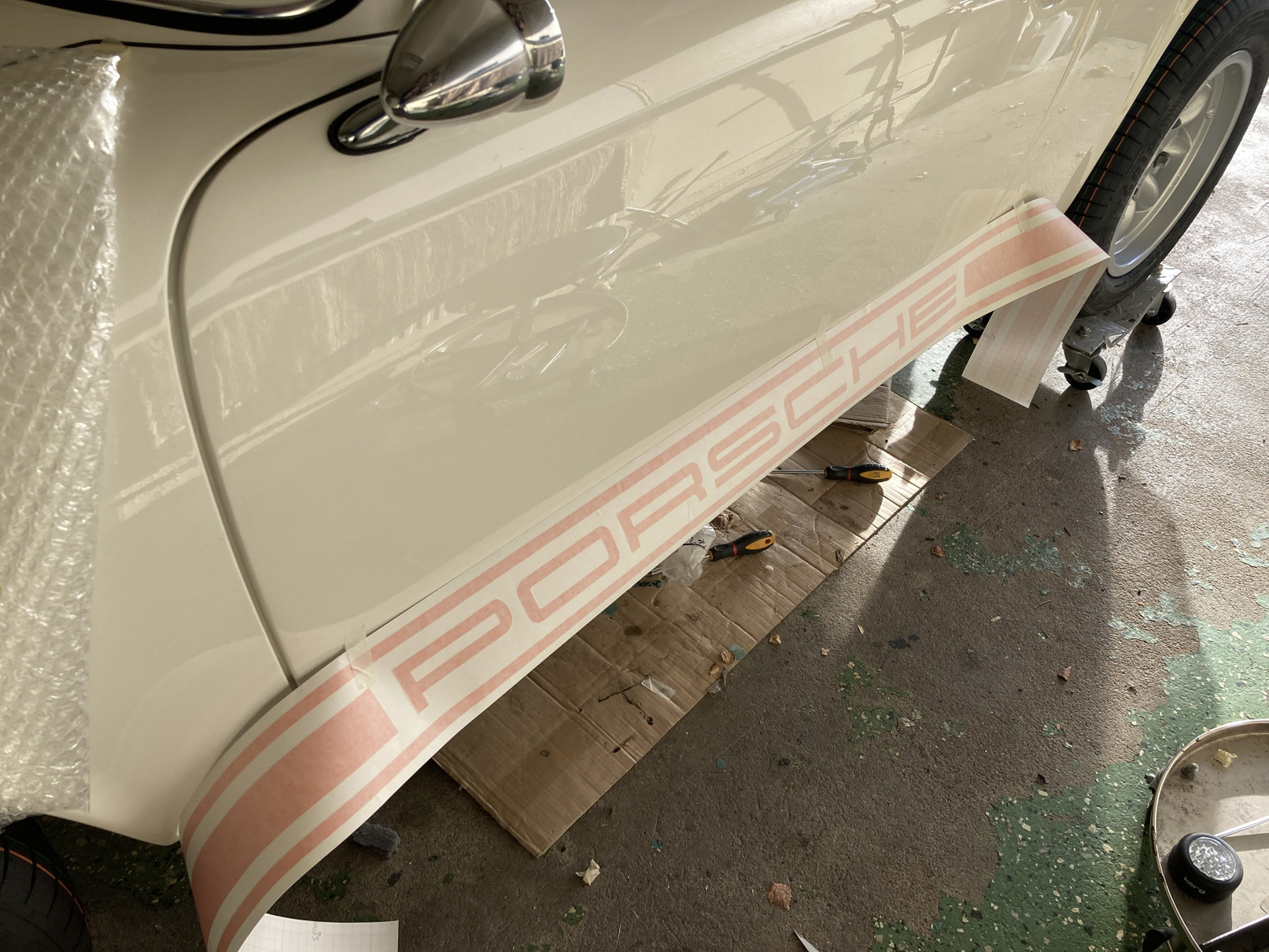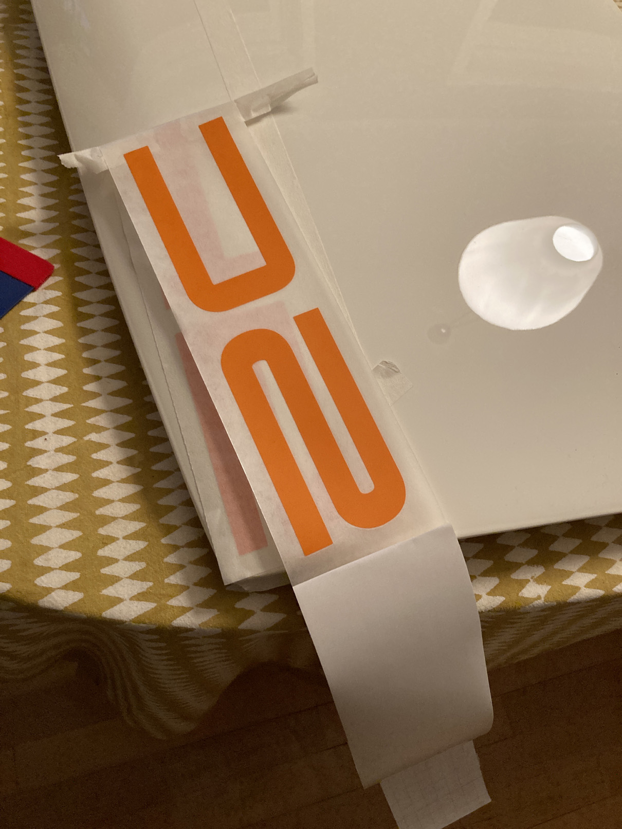 Jag jobbar som grafisk formgivare så jag kunde göra dekalerna exakt så som jag vill ha dem. Utifrån mitt underlag så skärs dem ut i en självhäftande vinyl av hög kvalitet. Därefter plockar man bort det som man inte ska använda och sätter på monterings film. Denna lyfter allt som är kvar från skyddspapperet så att man kan montera. Mycket mätande och inpassande innan man kör, lägg upp maskeringstejp som man kan följa. Här skulle jag såklart ha haft blå eller grön tejp, det hade varit lättare att följa. Gör rent med T-sprit och sedan kan man köra. Jag har gjort en hel del sånt här när jag var yngre så jag har lite vana, även om det var 30 år sedan!
