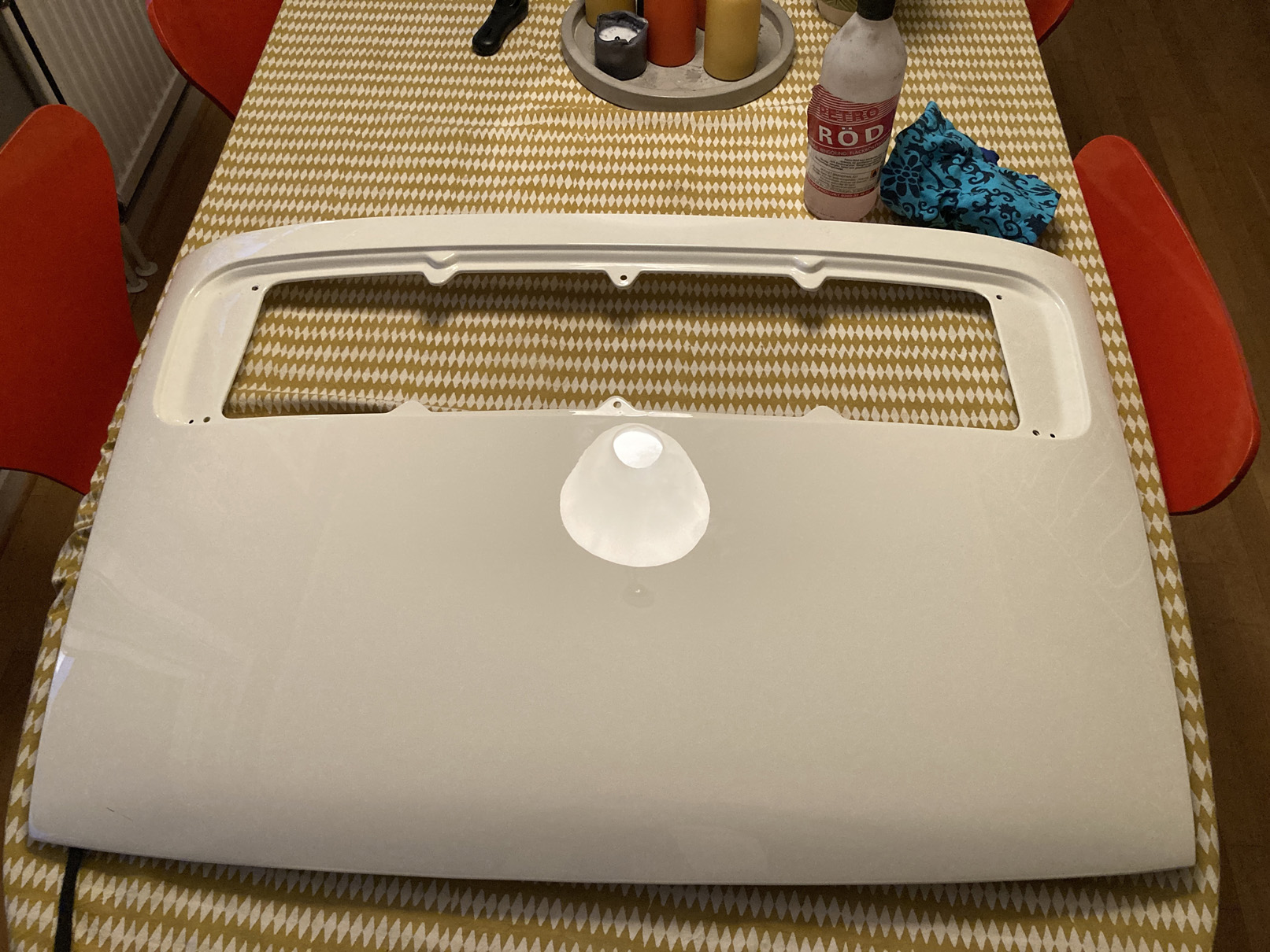 Började med bakluckan där jag lagt igen hålen för original emblem. Jobbar på köksbordet som ni ser...