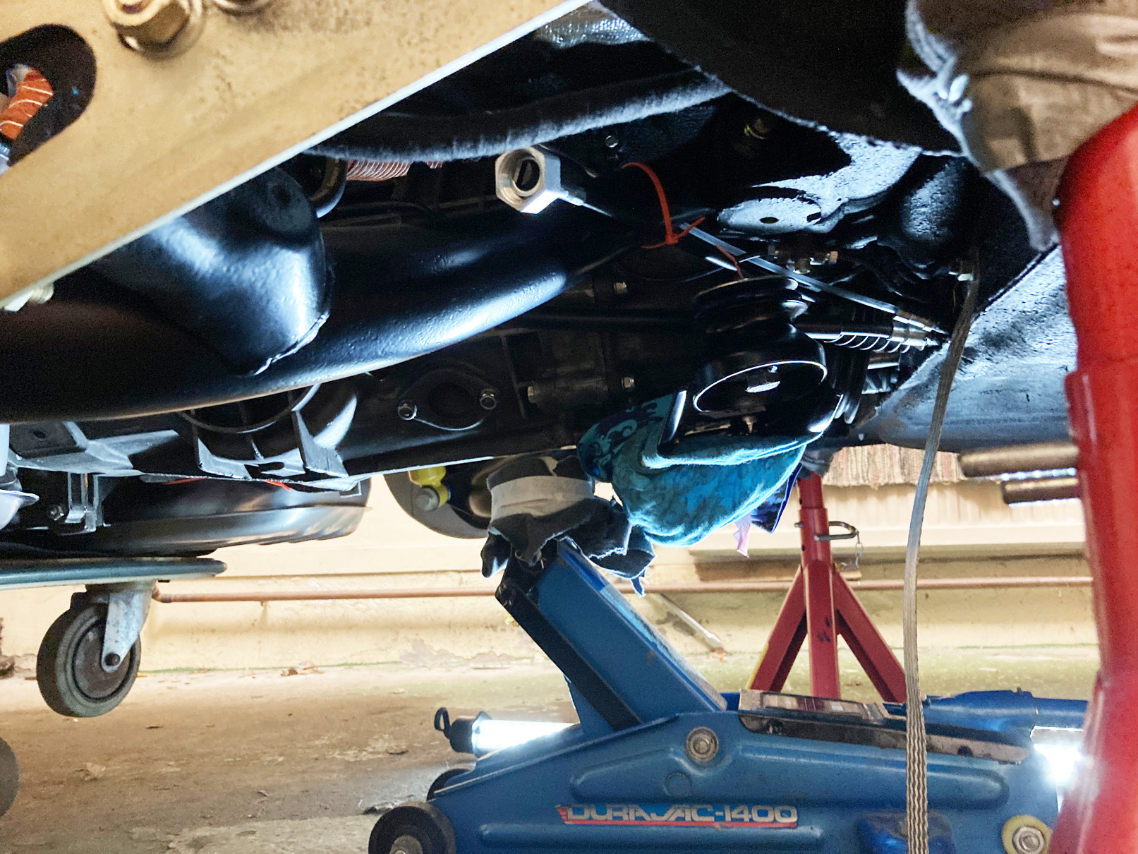 Både motor och låda sitter i karossen med fyra bult, två på växellådsbalken och två i bakkant i motorutrymmet. De som sitter på växellådsbalken är gängade i karossen så här får man ta det lite varligt så man inte får gäng-paj. Det hade inte varit roligt...