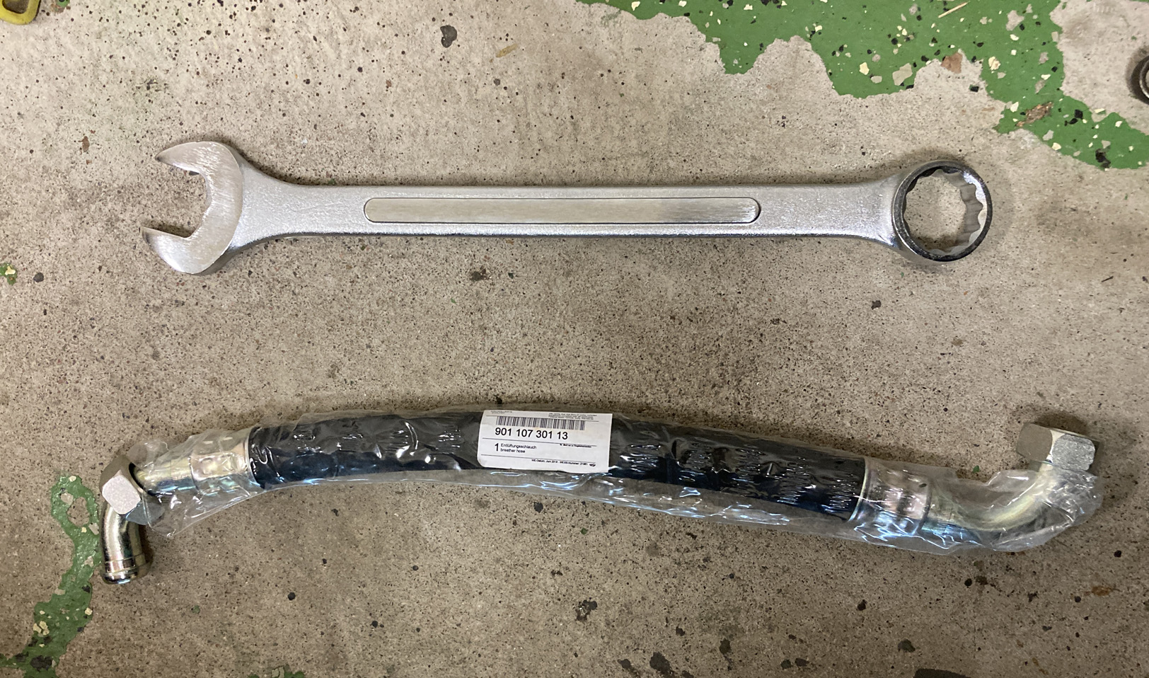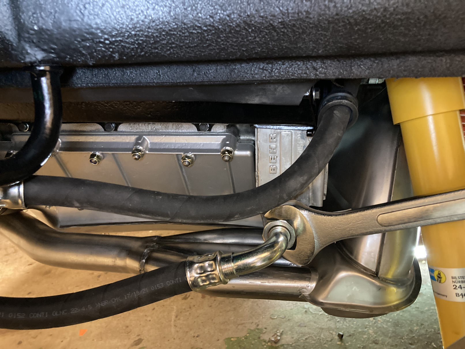 Börjar lite enkelt med oljeslangarna. Returen sitter ju redan på motorn som jag visat innan. Ansluts i den främre anslutningen på oljetanken. På den korta för inloppet är det rejäla verktyg som behövs. Sån tur så hade jag en 36 nyckel! Den korta slangen ansluts vid oljekylen. Dock så har anslutningen inget med kylning att göra, det är bara ett rör som går rätt in till oljepumpen. Se principskissen som jag lade ut innan.