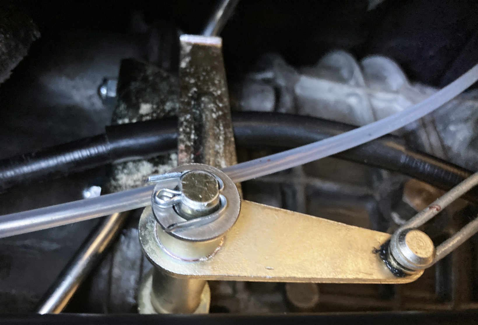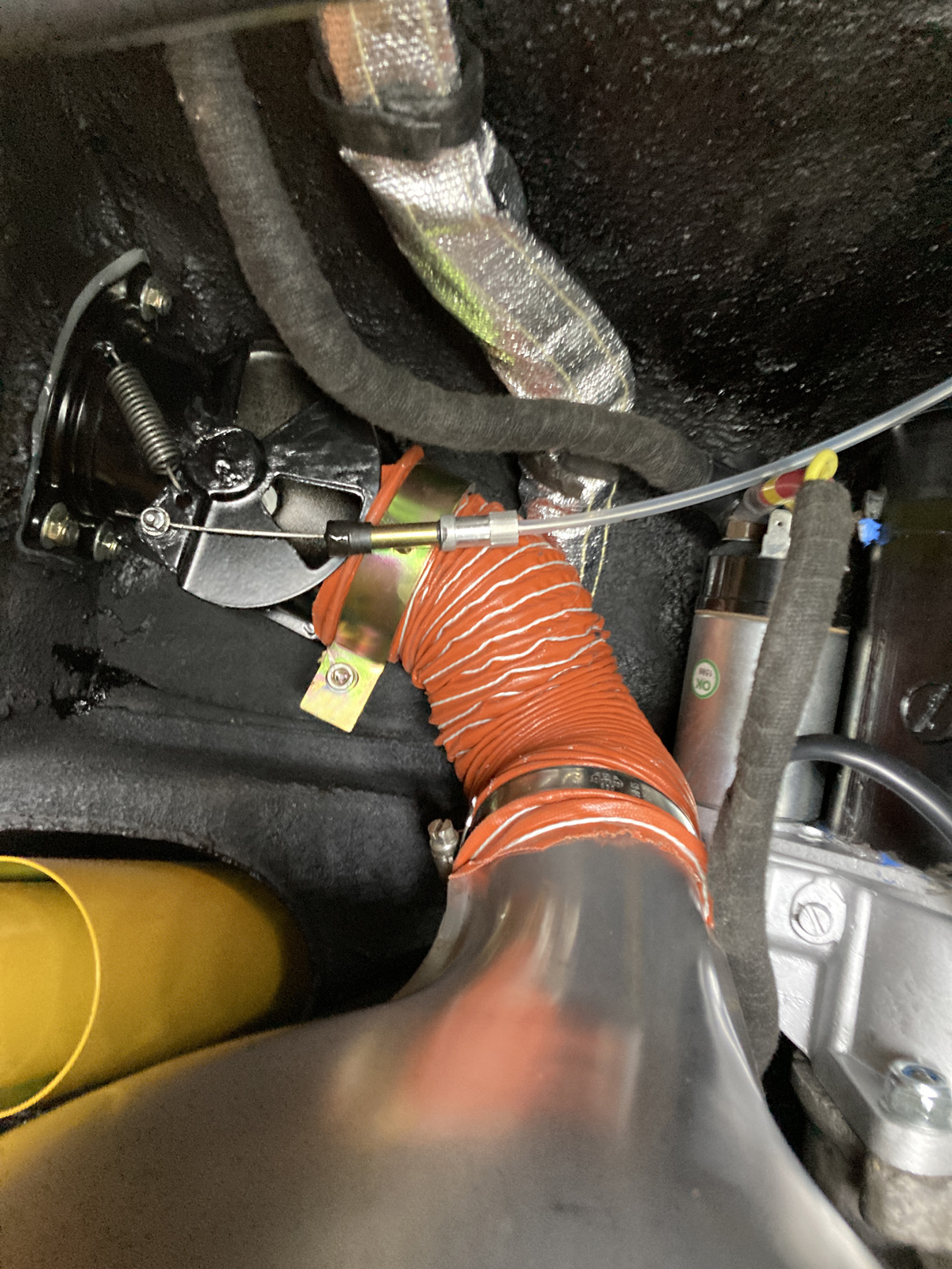 På denna bild ser ni flexslangarnas anslutning. Spjällen och deras vajer som går i de transparenta plaströren. Ni skymtar också +kabeln som går till startmotorn.