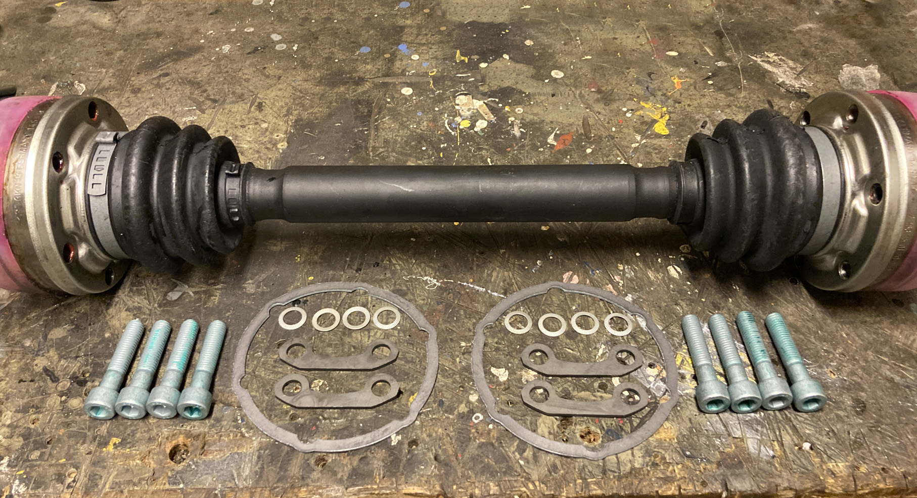 Hej igen! Nu var det dags att montera drivaxlar. Jag hade inga att renovera så jag köpte nya. De kommer färdiga med fett. Det som ytterligare behövs är packningar, bultar, schnorrbrickor, och de halvböjda brickorna med två hål i. De sistnämnda behövs för att scnorrbrickan ska bita, lite mjukare metall i den således än i själva drivknuten.