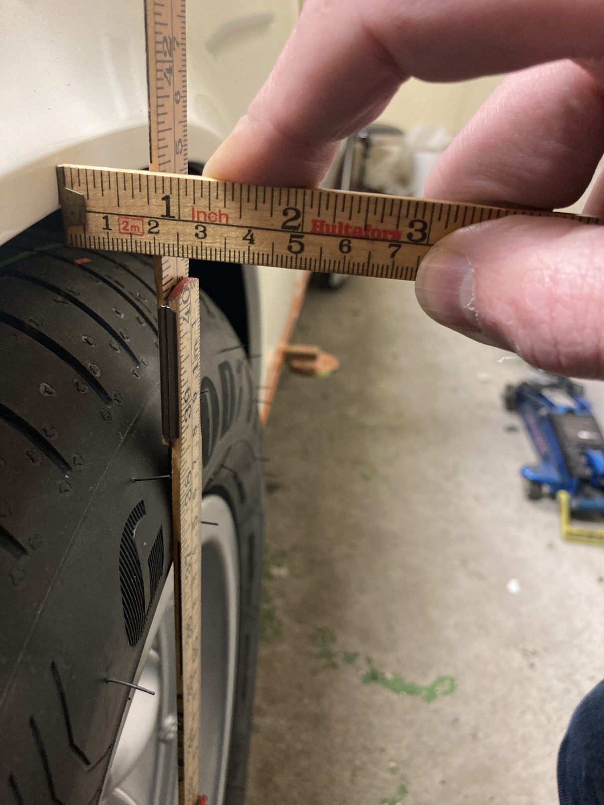 Som det är nu så ligger däcken ca 20 mm för långt ut. Funderade på att försöka få 185/65 att funka på mina 7-tumsfälgar men jag tjänar bara 10 mm på det.