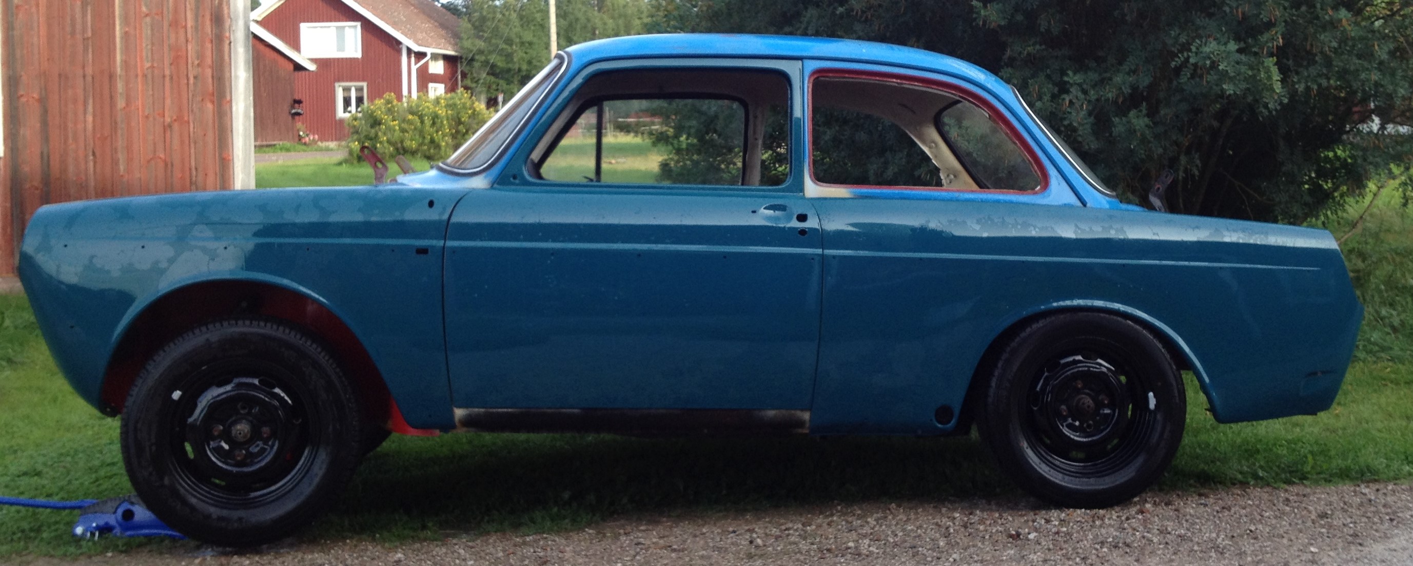Har en notchback som jag tyvärr insett det saknas tid för. Bottenplattan är färdigställd, likaså framvagn och nya bussningar, alla skärmar, huvar och dörrar färdiglackade. Nya kromlister införskaffade(gamla finns kvar), 2st kompletta extradörrar som man får plocka över glas och interiör på. Bilen ombyggd till 4-ledad bakvagn med större trummorna samt fram större bromsok ifrån -72. Allt komplett, rutor, lysen, bra tank, fina kofångare, Vx-låda monterad, drivaxlar, Öhlins dämpare, dragkrok finns också. Motorutrymmet modifierat, fronten upptagen för kylare(har en extraplåt för igensättning om man vill). Motoreffekt i papprena höjd till 51Kw. Däck/fälg model äldre ingår, några är olika jubileumsmodeller.