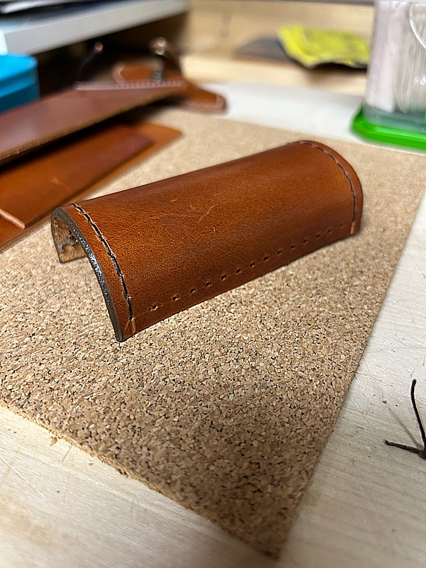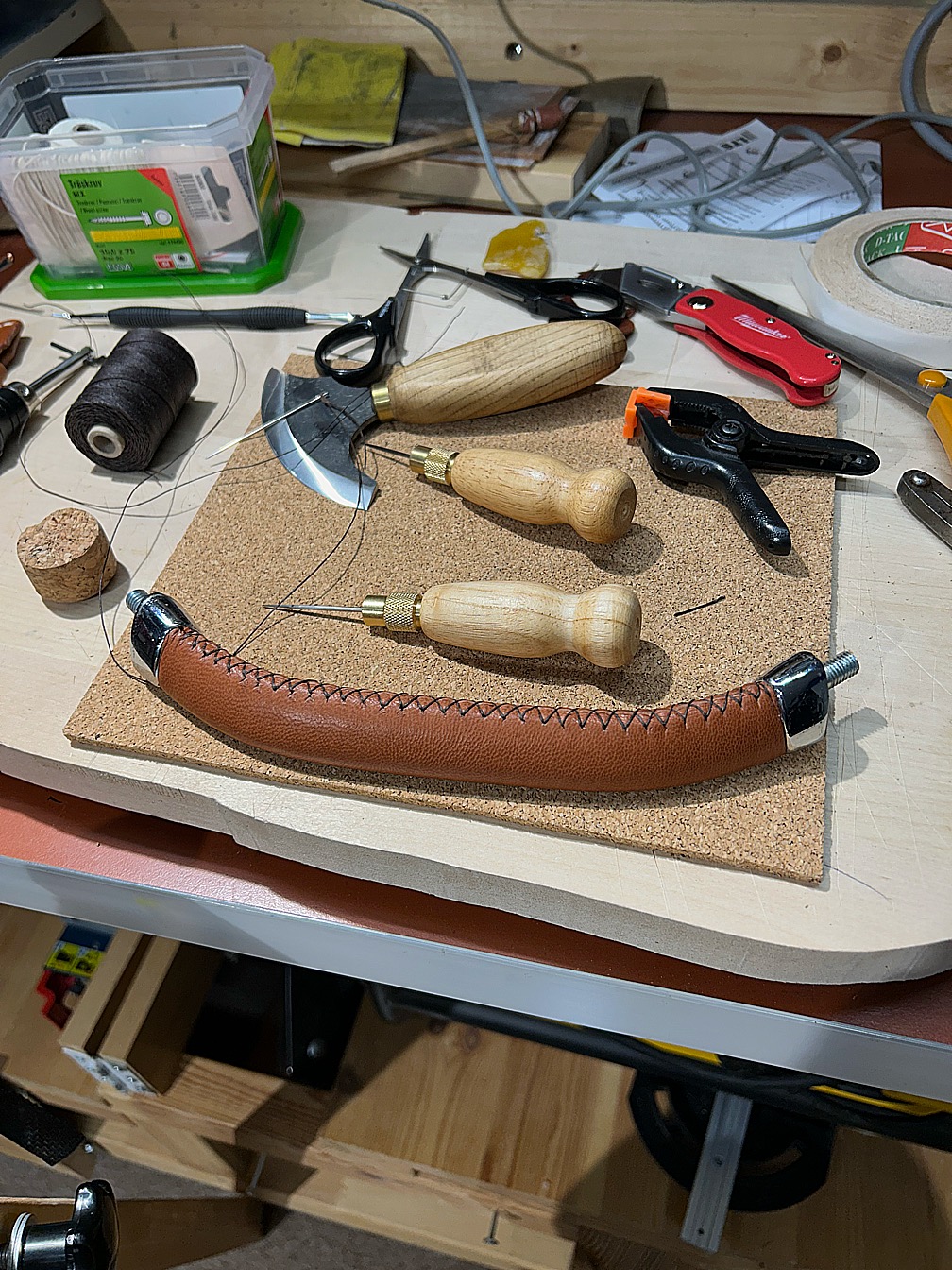 Tack! Idag gav jag mig på handbromsen. Jag sydde sömmarna i ändarna och färgade kanterna som fick torka i verkstan men sydde den längsgående sömmen på plats. En tunn dubbelhäftande tejp användes för att den inte ska glida. Det var lite pyssligt men gick bra tillslut.