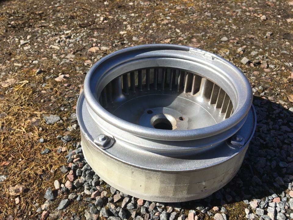 Slipade ner både skivan till generatorn och fläkthjulet innan omlackering. Det var ju för trångt att komma ner i kilremspåret ordentligt med snabba verktyg så det blev till att sitta i vårsolen med en fil och långsamt jobba bort rosten för hand.  ICQ/ad